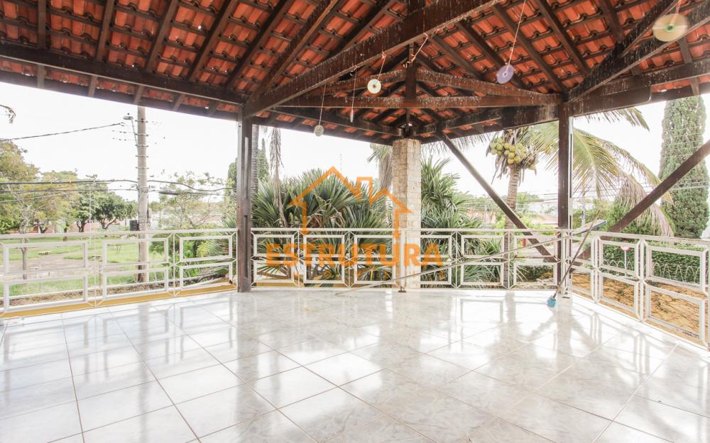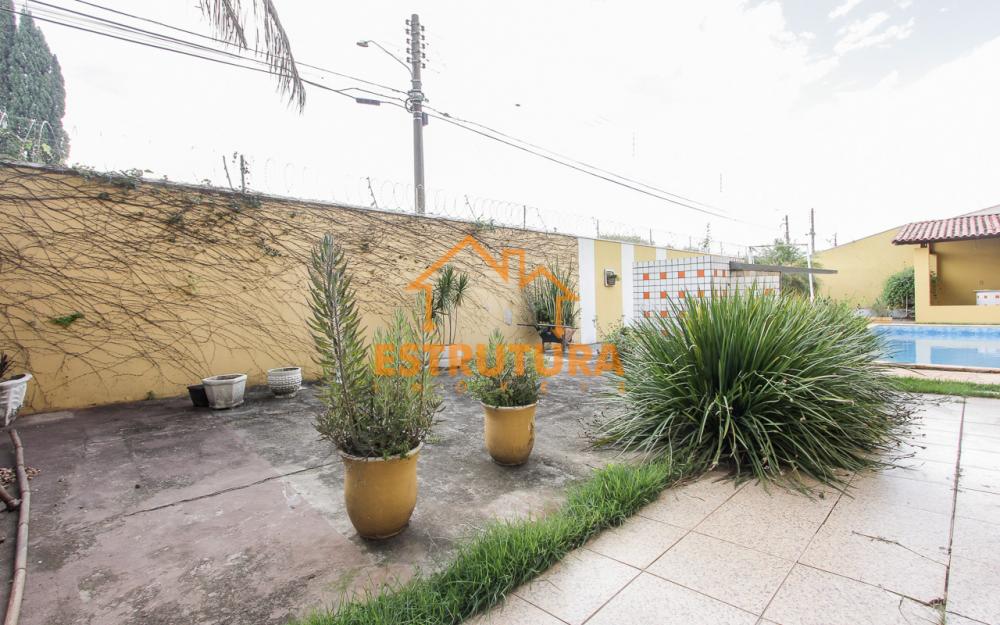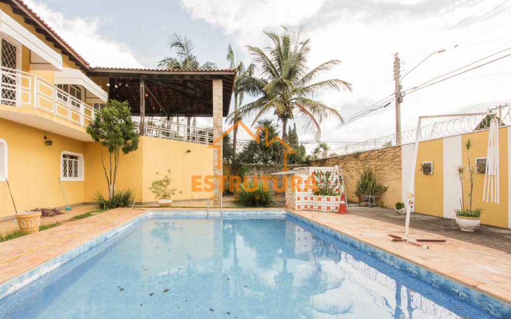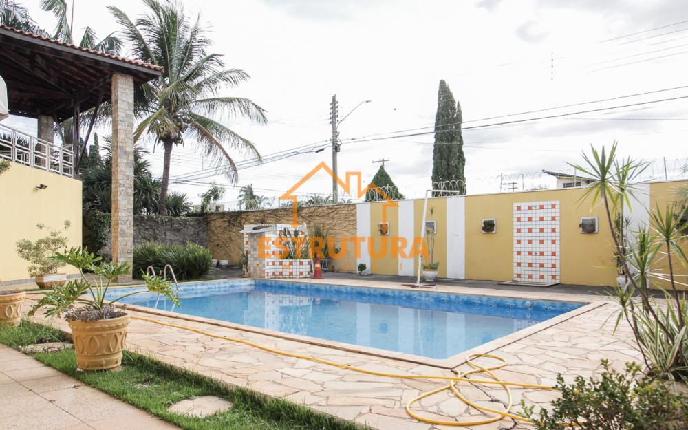 Chácara contendo garagem para vários carros, 3 dormitórios, sala de estar, cozinha estilo americano, banheiro social, área de serviço, campo de futebol, salão de festas, churrasqueira, 2 banheiros sociais e piscina.