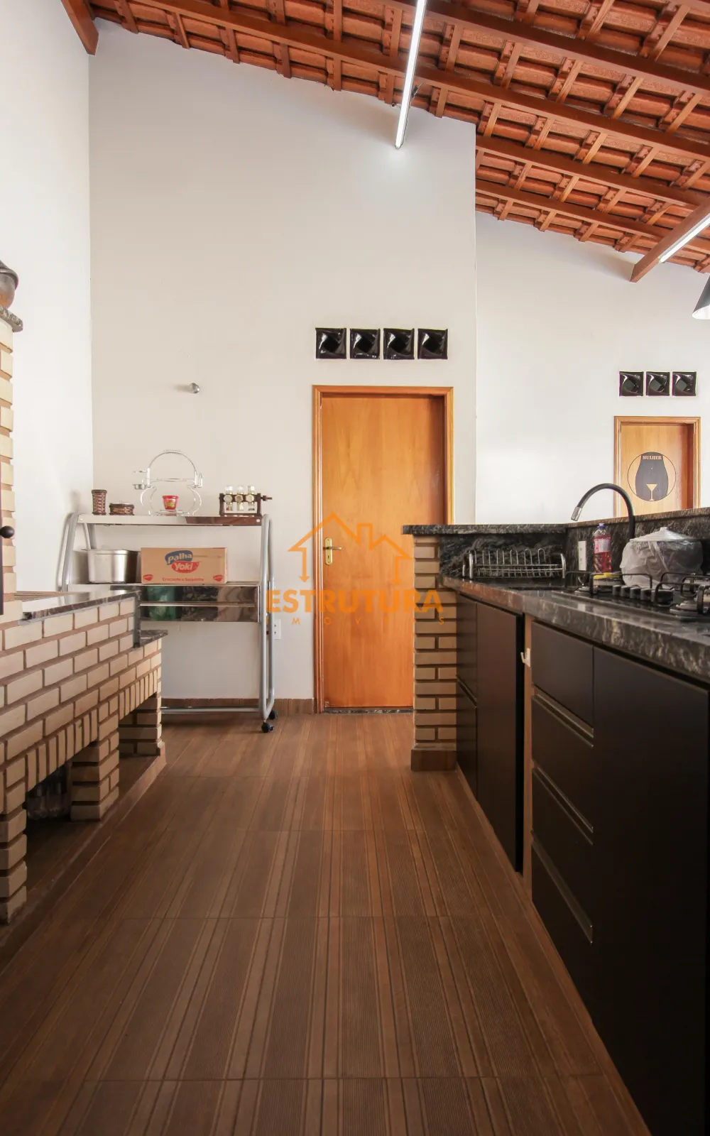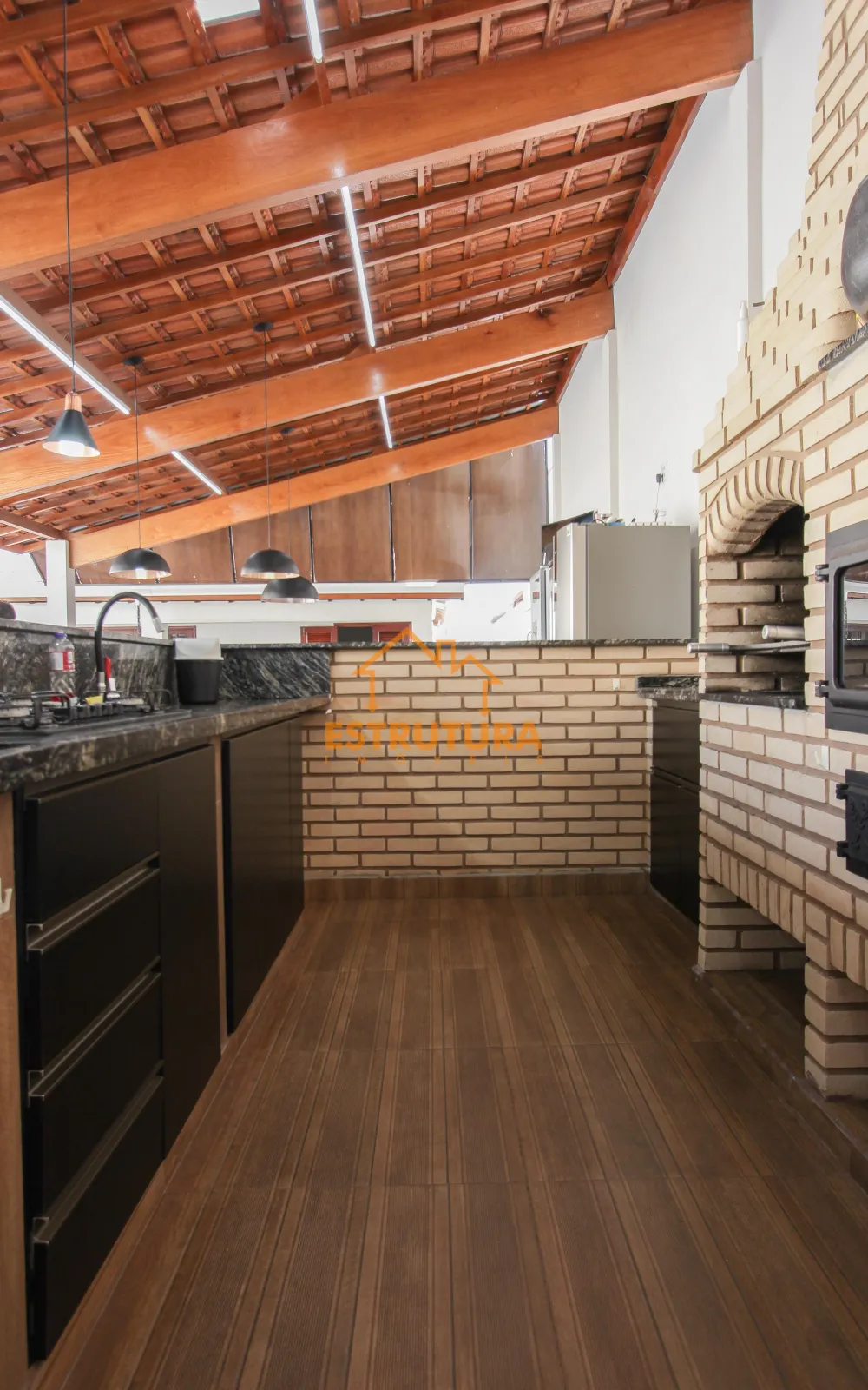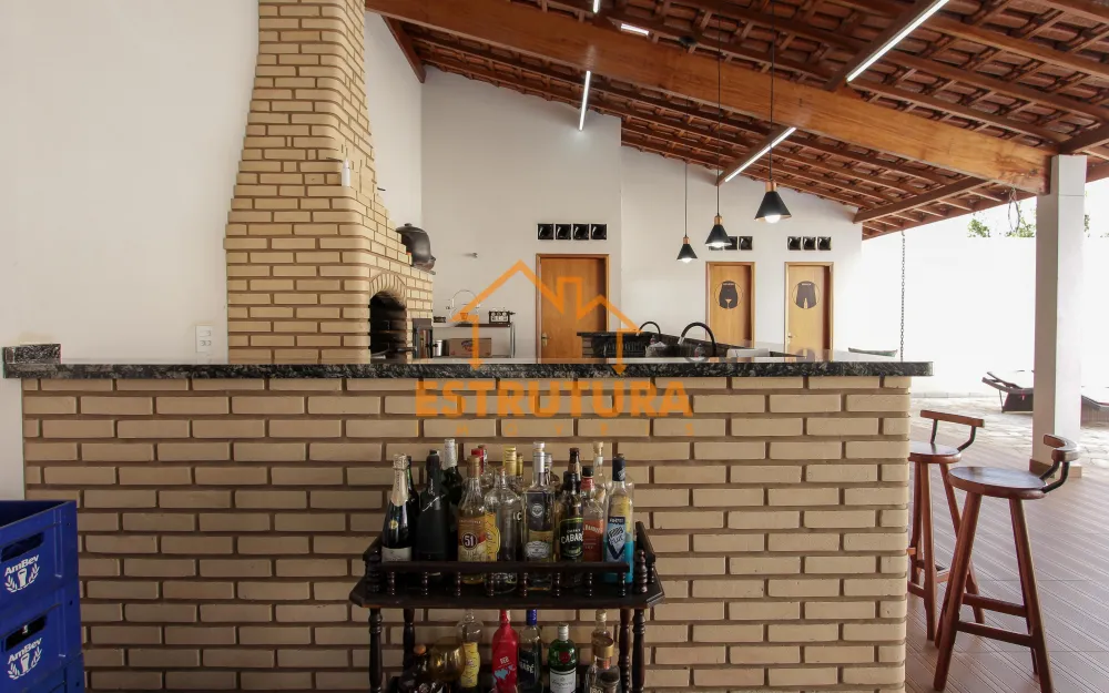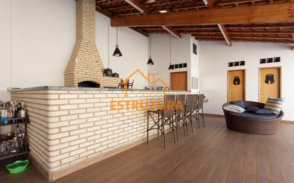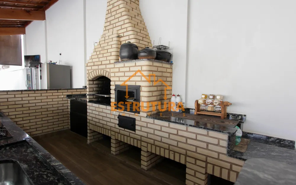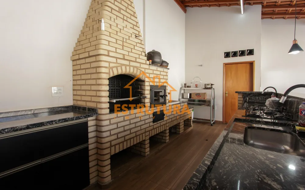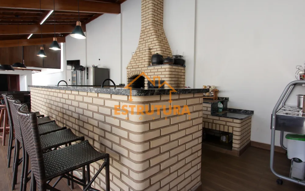 A área gourmet é completa, com piscina, churrasqueira, fogão a lenha, forno, cooktop e móveis planejados. Há ainda 2 banheiros adicionais e um quarto de despensa.