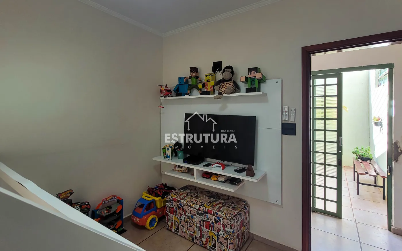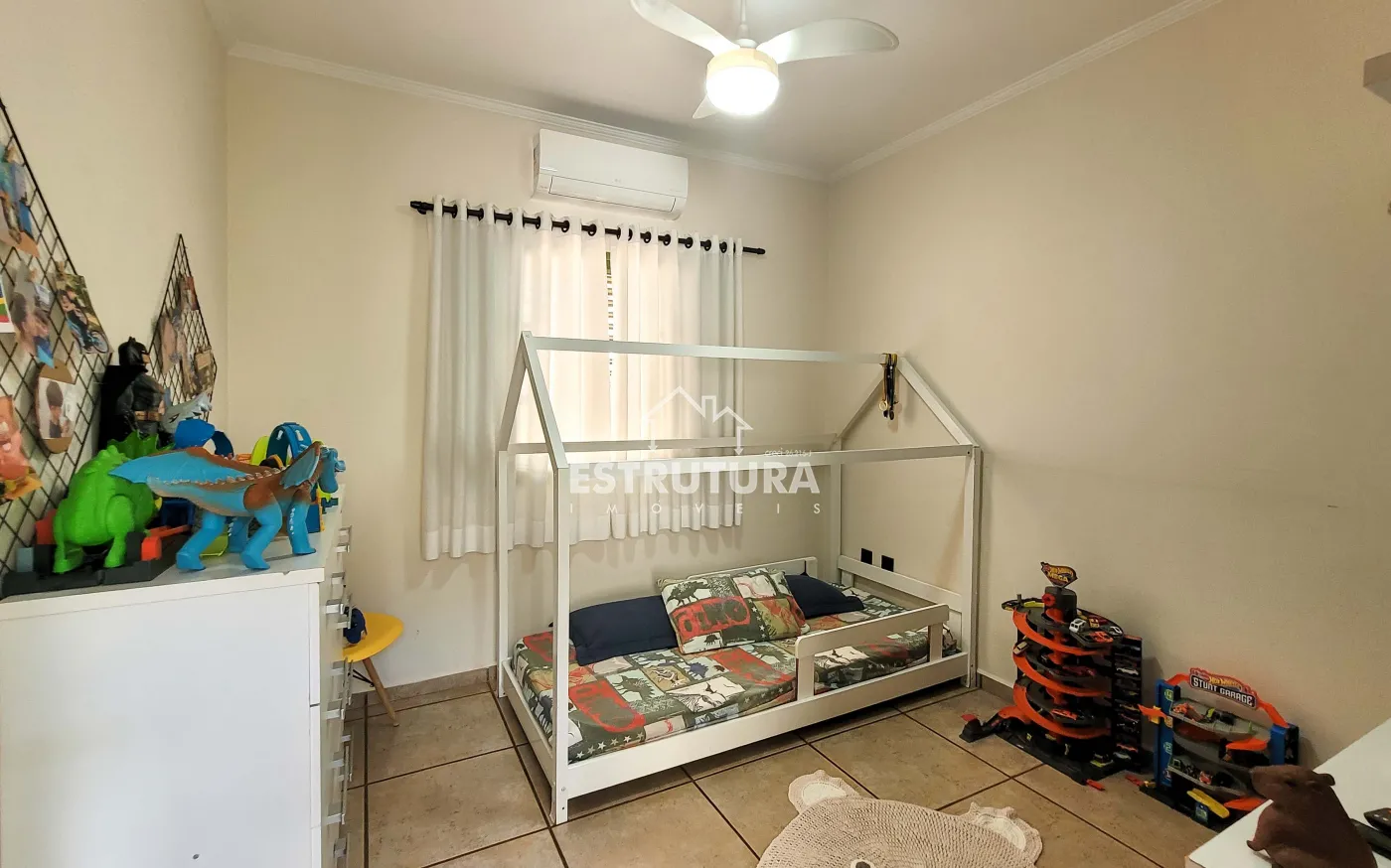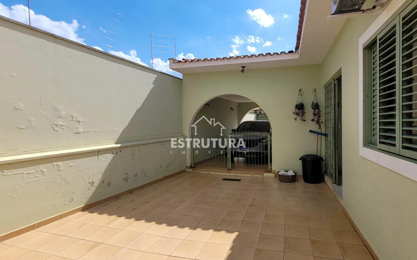 Possui garagem para 2 carros com jardim na frente, ampla sala para dois ambientes com preparação para ar-condicionado, cozinha com armários planejados, área de serviço fechada e área de luz que garante boa ventilação natural.