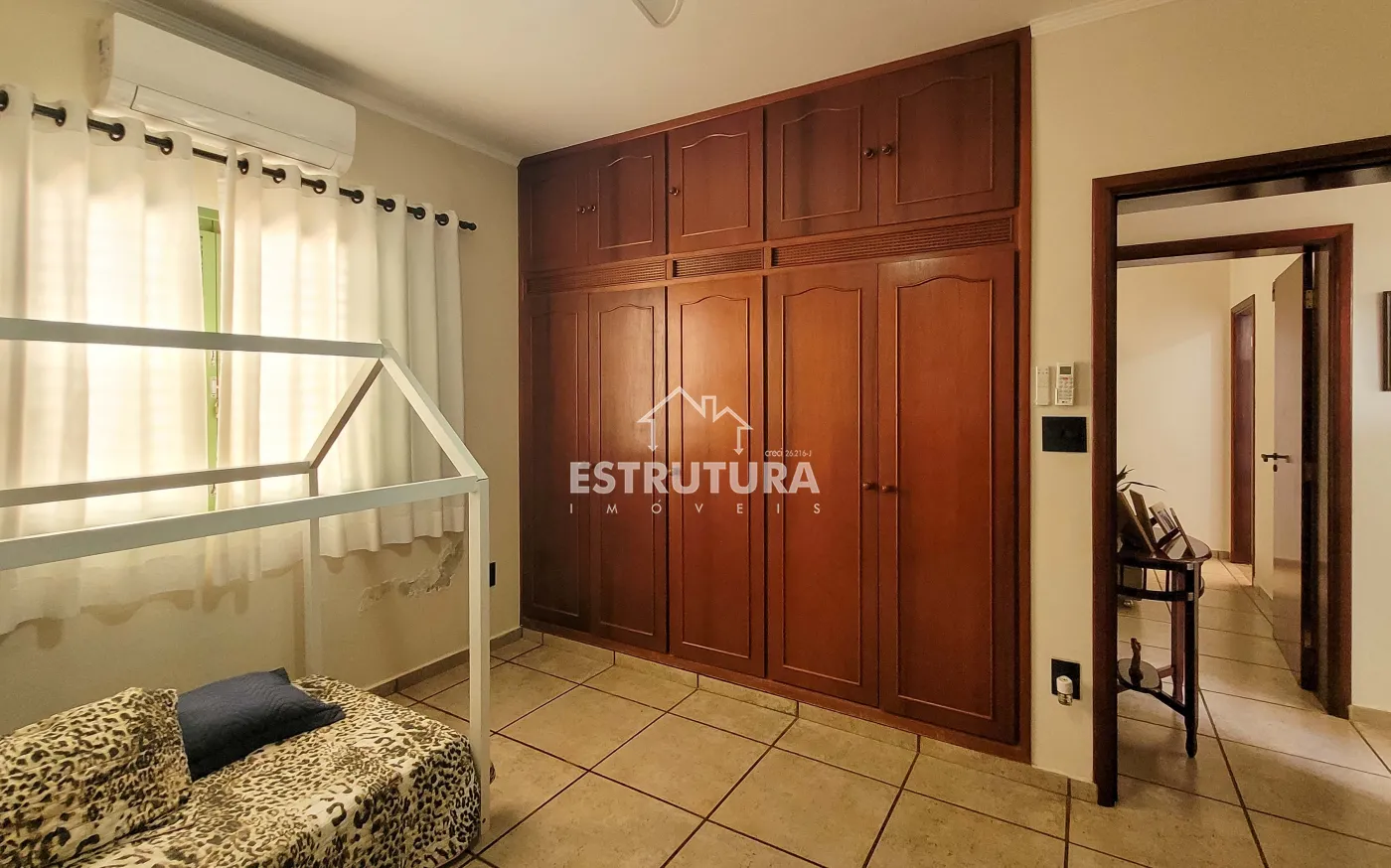 São 3 dormitórios, sendo 1 suíte com armário em madeira maciça e outro dormitório com armário, todos equipados com ar-condicionado. Conta ainda com banheiro social.