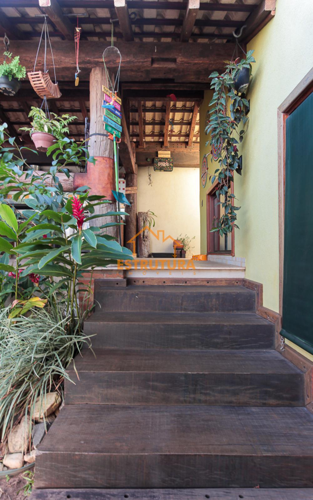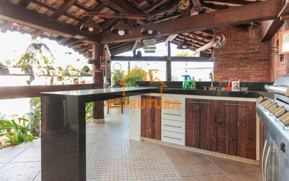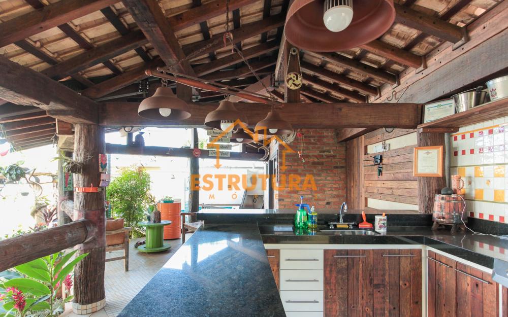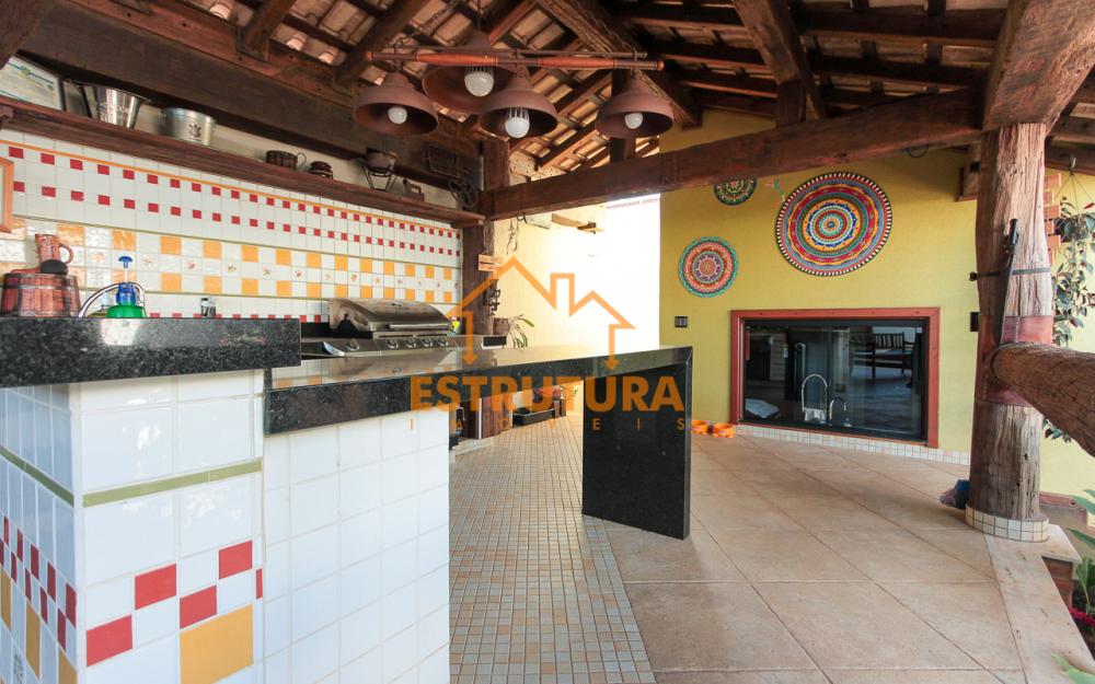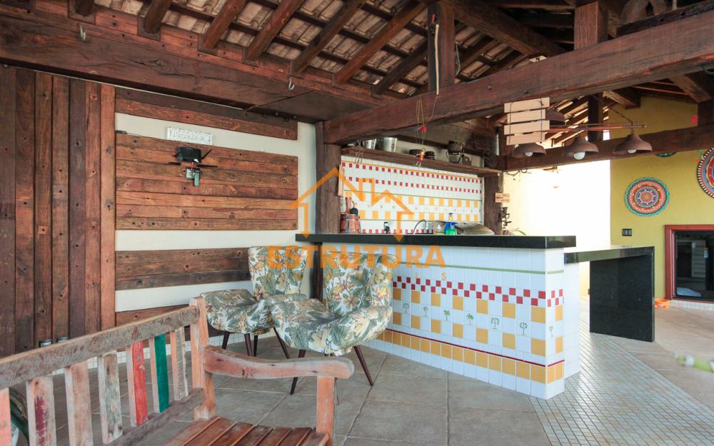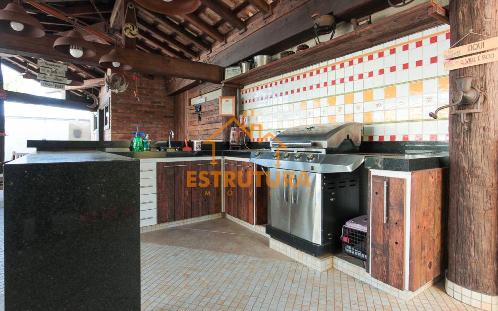 O imóvel possui 3 vagas de garagem com pergolado de madeira Aroeira e trepadeira. Sua área externa foi criada para proporcionar a sensação de encantamento e acolhimento. Toda em estilo rustico, possui banheira spa com hidromassagem aquecida, lavabo, sauna, e uma grande área de lazer com lustres, bancada de serviço com móveis também em madeira Aroeira e churrasqueira profissional a gás.