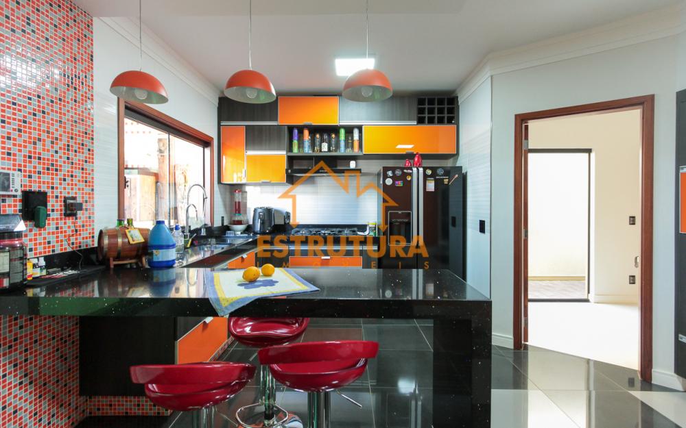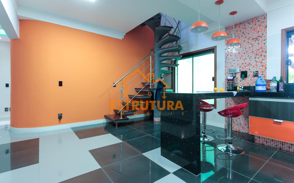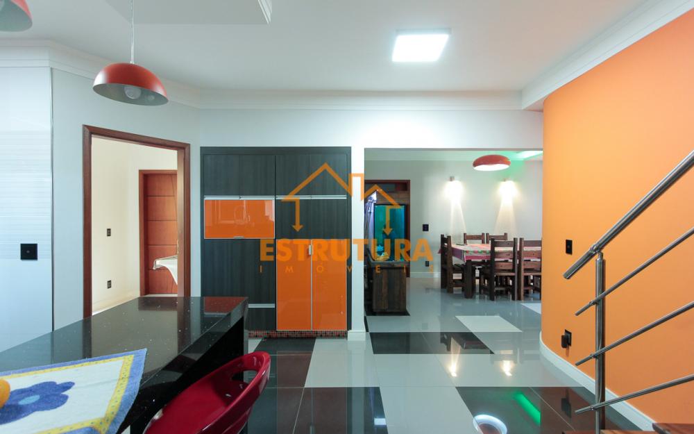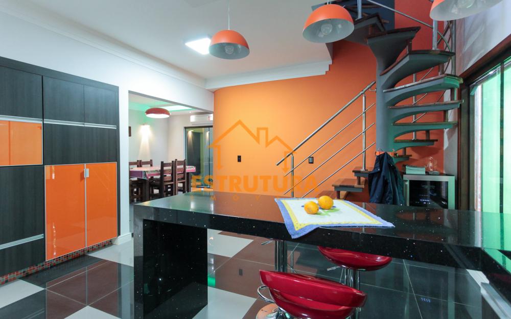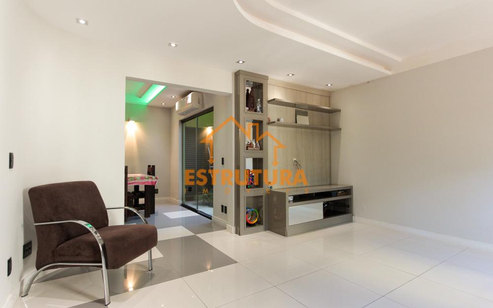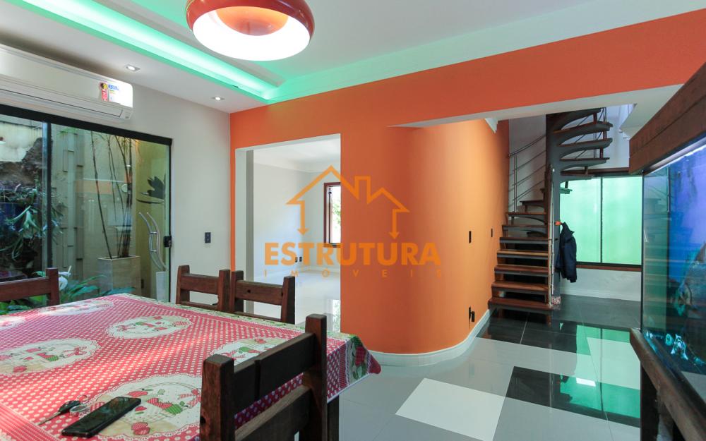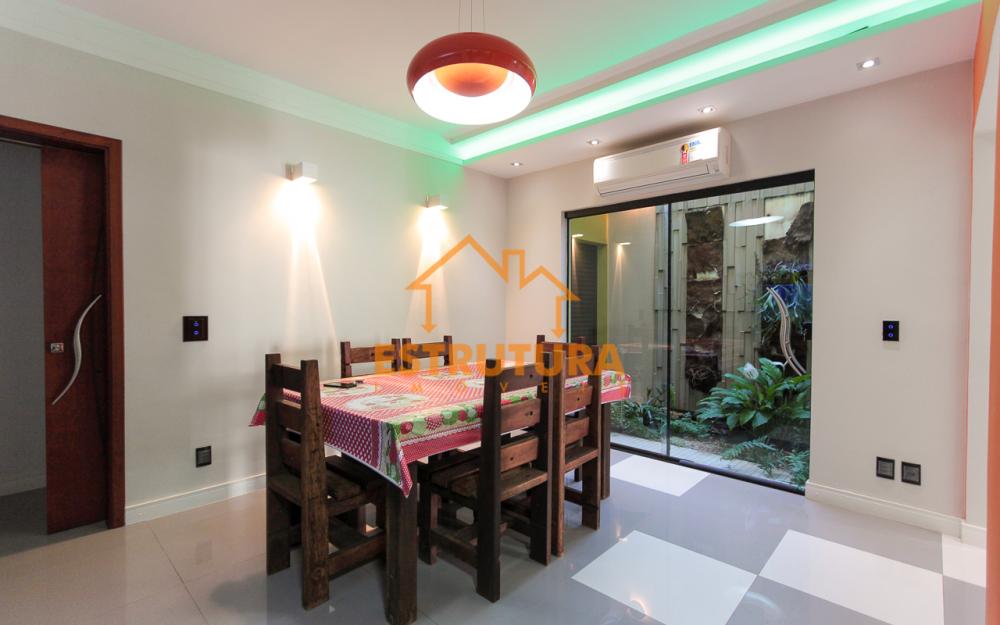 Em seu pavimento inferior possui hall de entrada, sala com painel de TV, e iluminação em led. Sala de jantar com iluminação pendente, jardim de inverno, cozinha com armários planejados, balcão para café e ampla área de serviço com despensa. Separados da área de convivência, há também 1 banheiro social, 2 dormitórios com móveis planejados, e 1 suíte com closet.