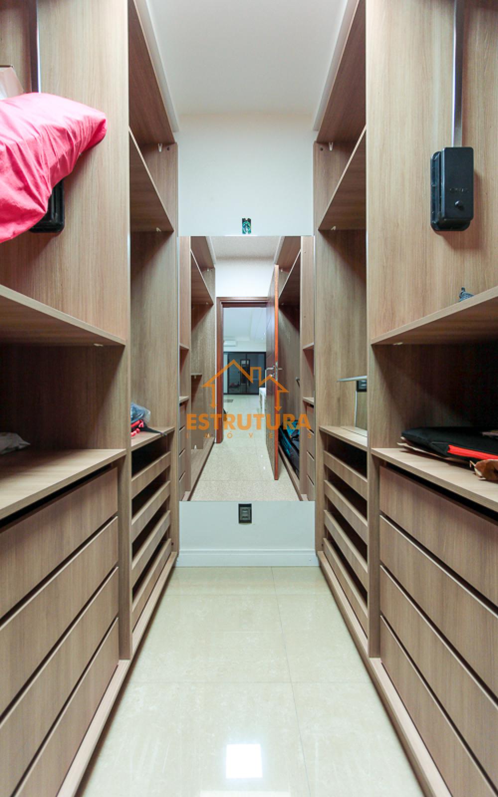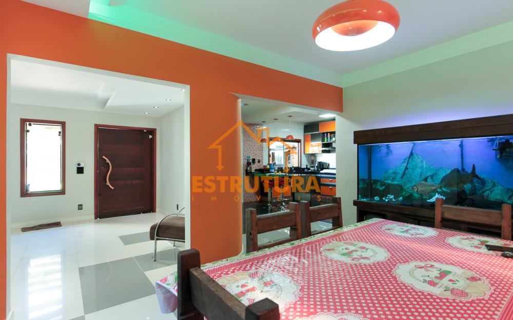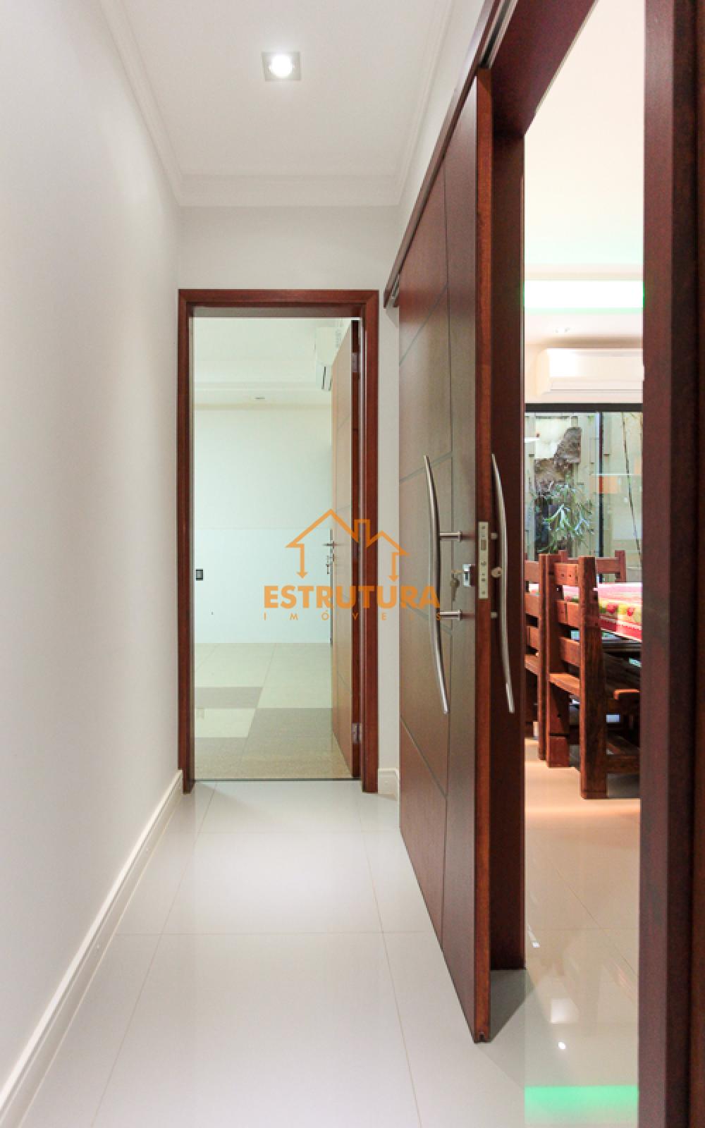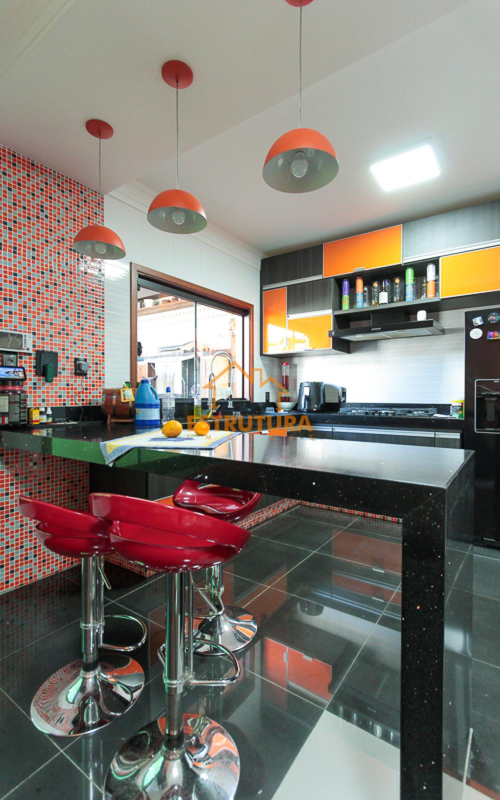 Em seu pavimento inferior possui hall de entrada, sala com painel de TV, e iluminação em led. Sala de jantar com iluminação pendente, jardim de inverno, cozinha com armários planejados, balcão para café e ampla área de serviço com despensa. Separados da área de convivência, há também 1 banheiro social, 2 dormitórios com móveis planejados, e 1 suíte com closet.