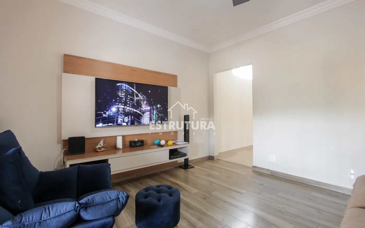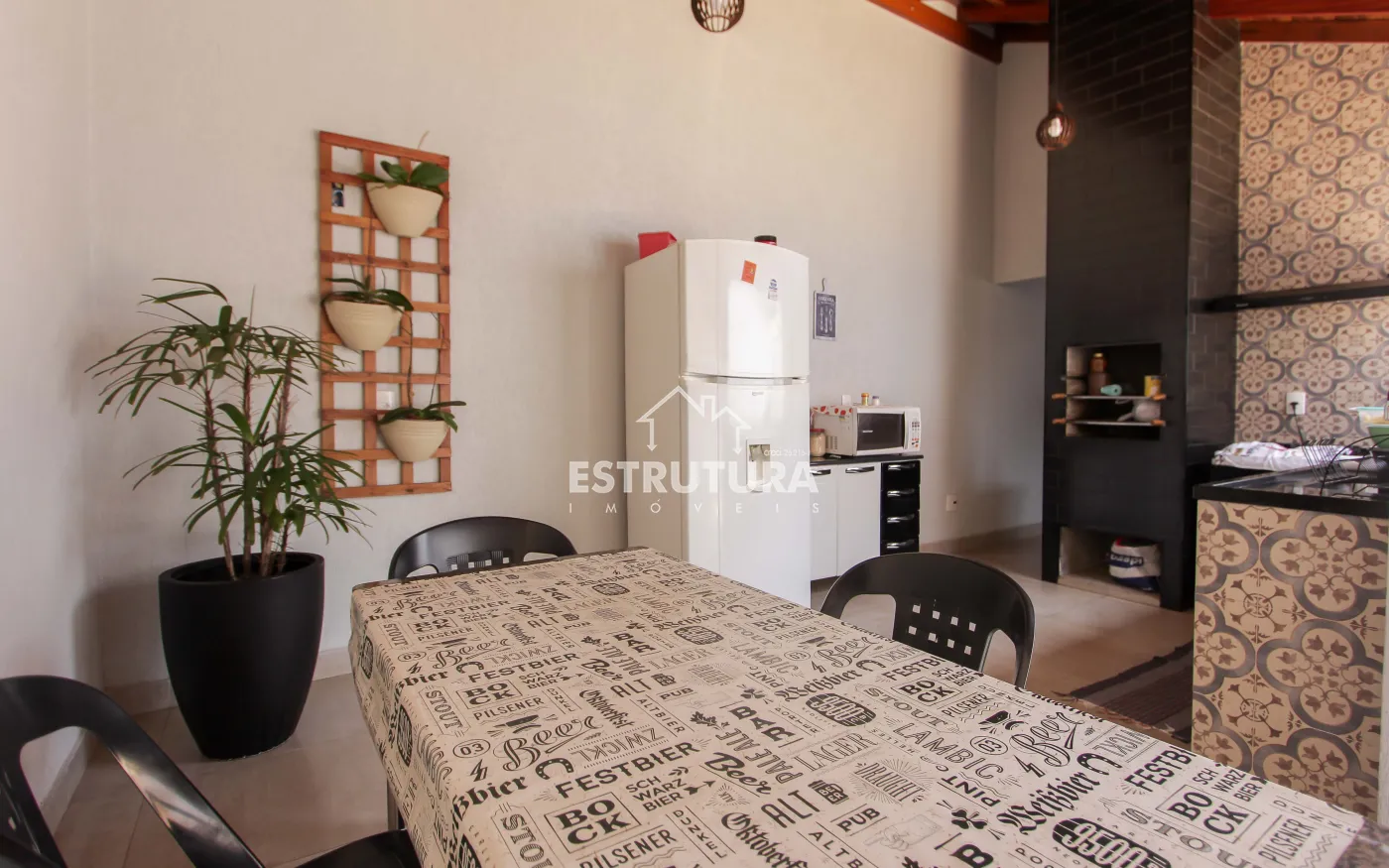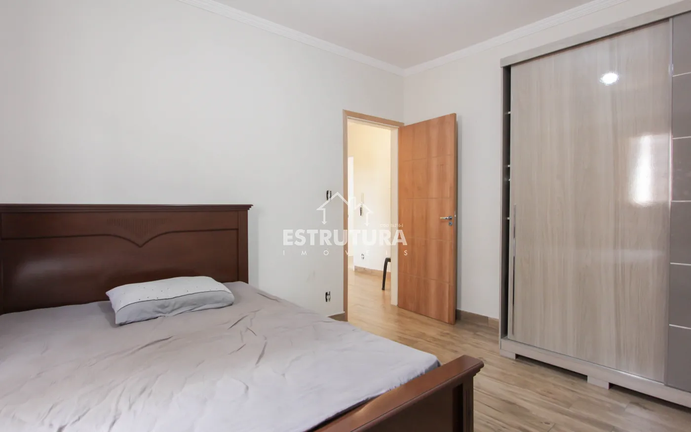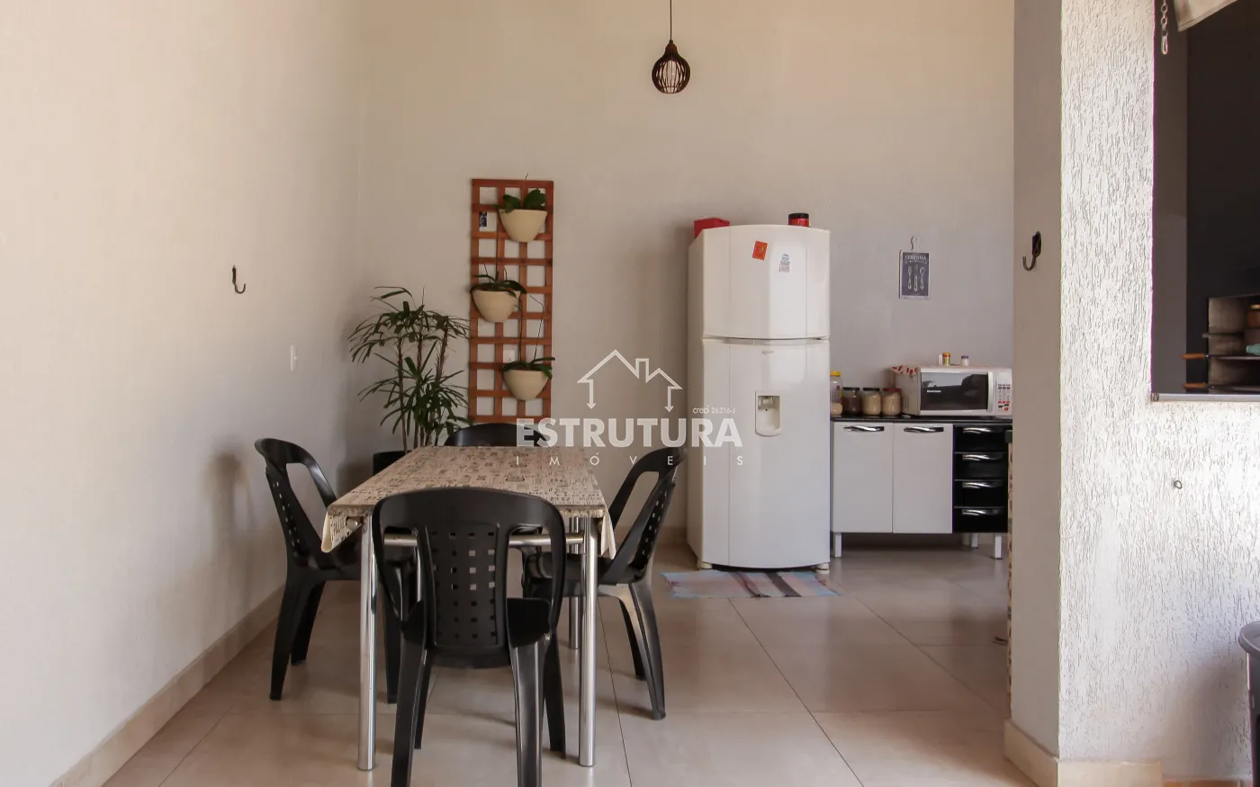 Casa contendo 3 vagas de garagem, sendo 2 cobertas e 1 descoberta, 2 dormitórios, sala ampla, cozinha e sala de jantar integrada, banheiro social, área de serviço, área gourmet, corredor e quintal.
