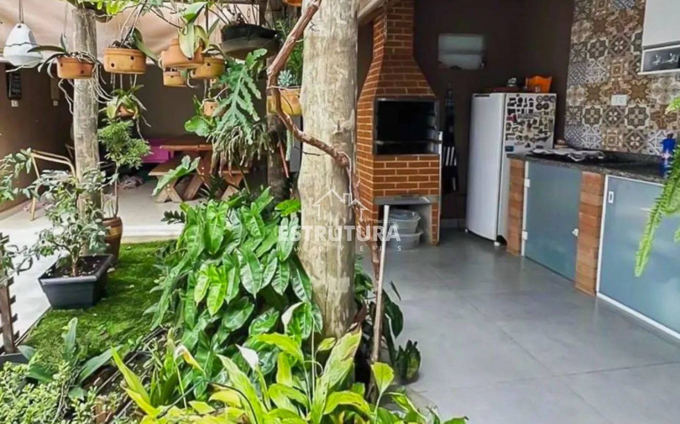 Piso inferior contendo 1 dormitorio, sala com painel e adega, banheiro, area de lazer com churrasqueira, lavabo, quarto de despejo, quintal com jardim e pergolado.