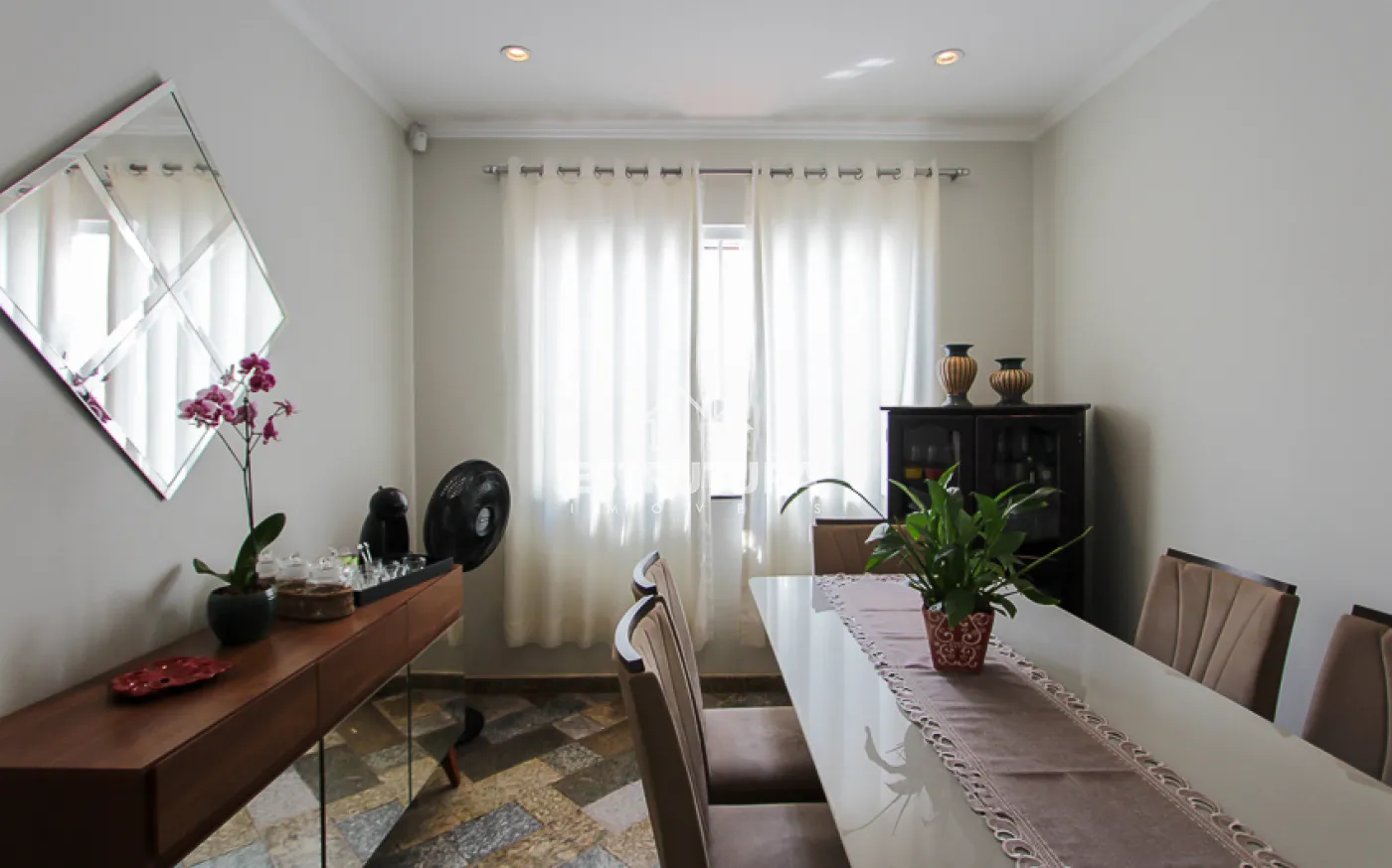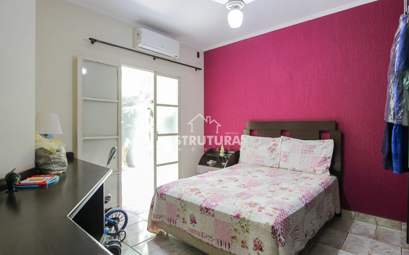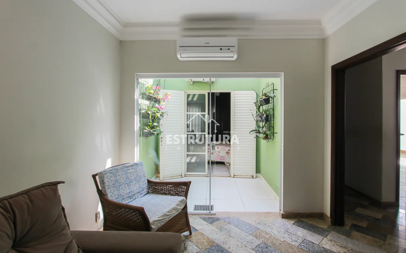 - Salas: sala de estar com rack e papel de parede, e sala de jantar também decorada com papel de parede. Ambas contam com ventiladores de teto e preparação para ar-condicionado.