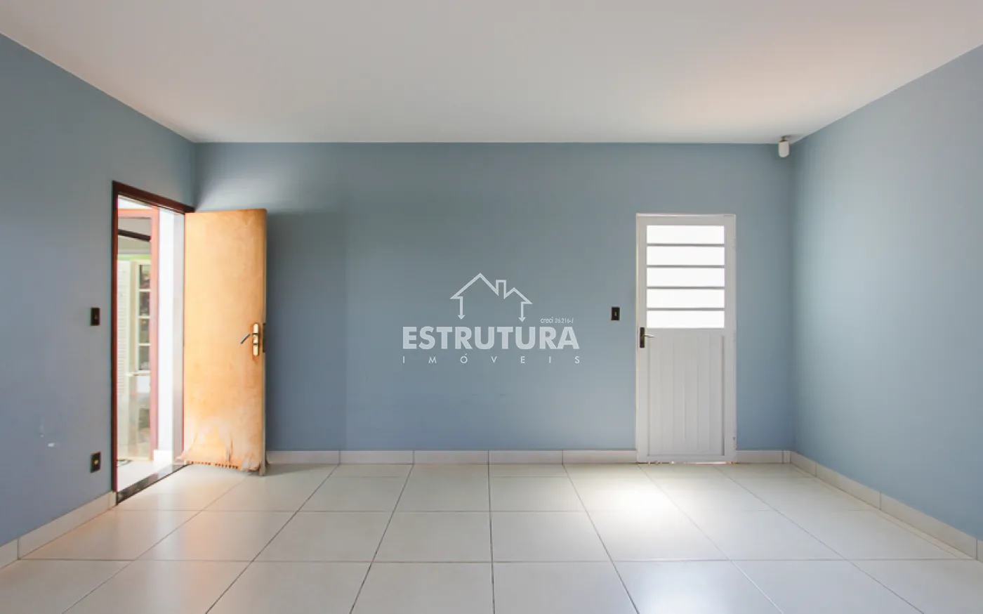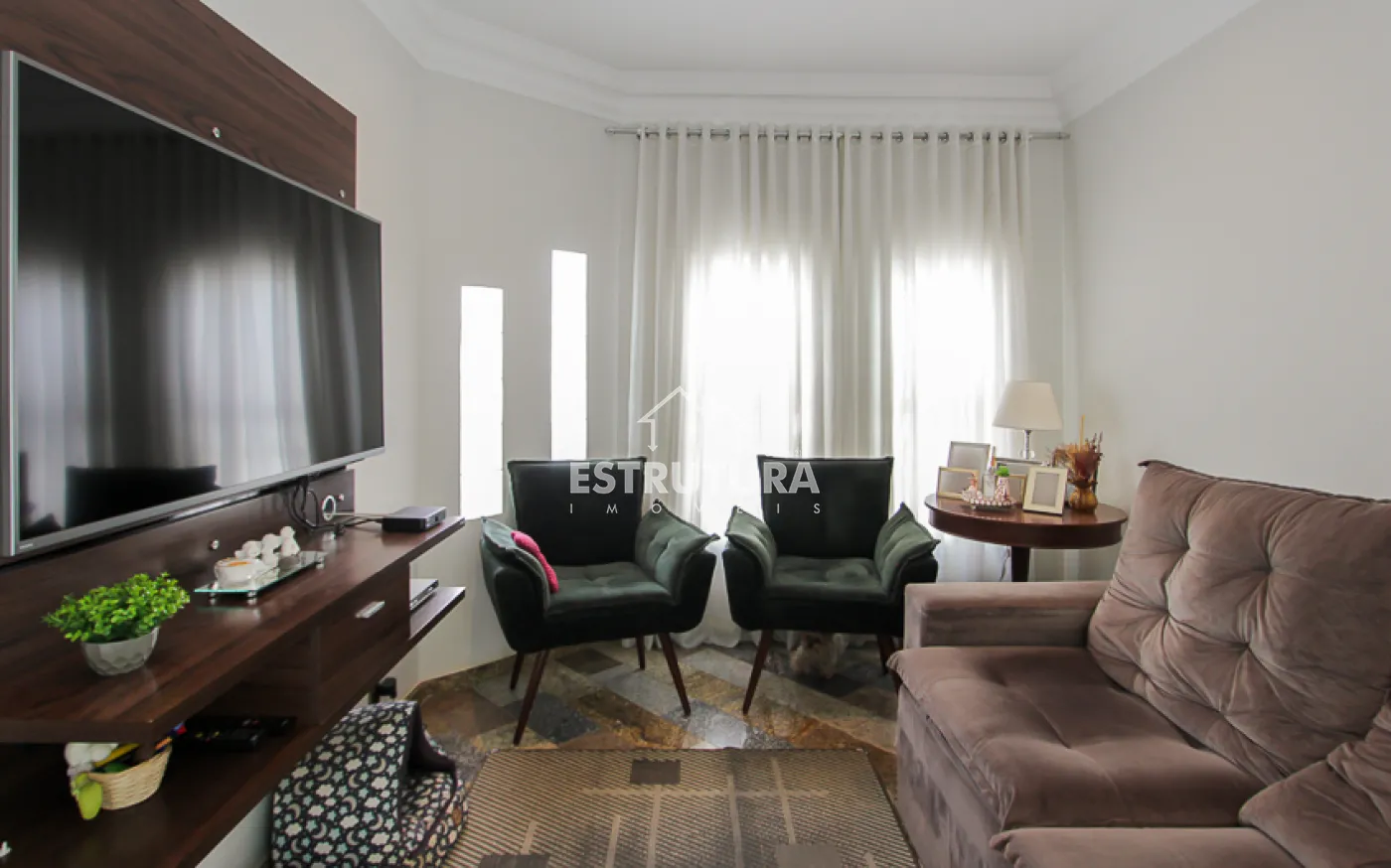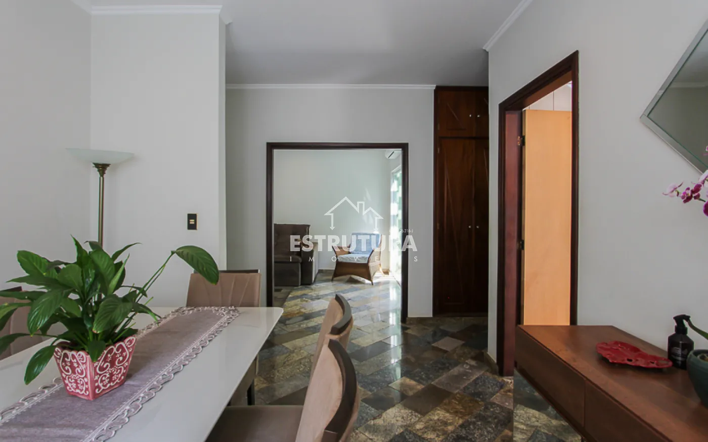 - Salas: sala de estar com rack e papel de parede, e sala de jantar também decorada com papel de parede. Ambas contam com ventiladores de teto e preparação para ar-condicionado.