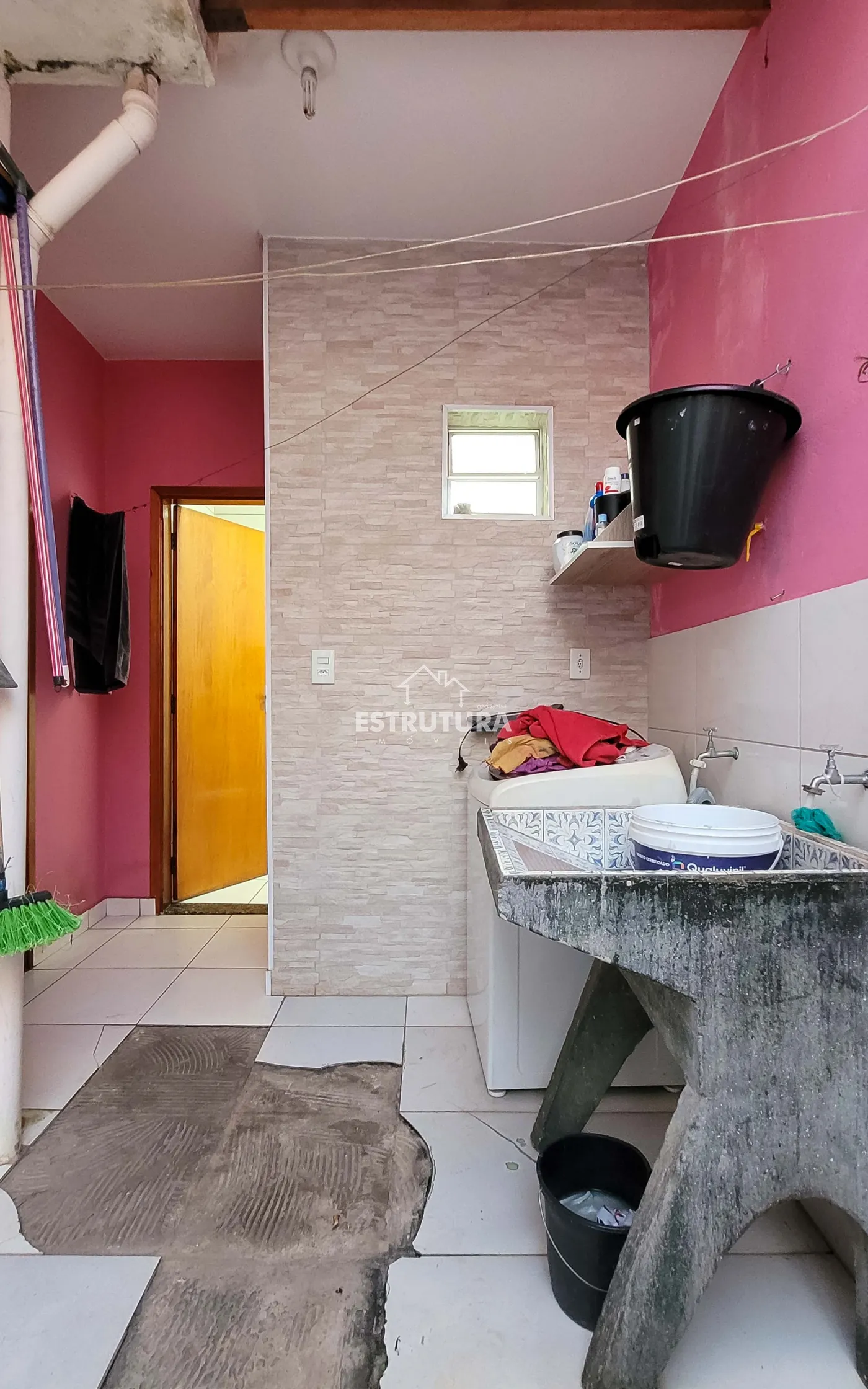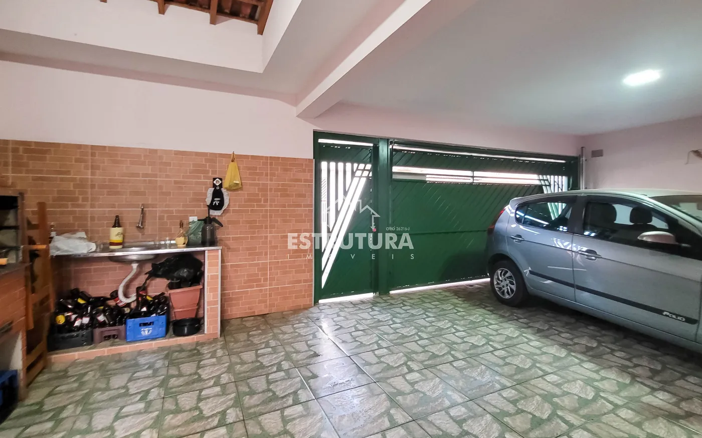 Casa com garagem para 2 carros, contando ainda com pia de apoio, ideal para quem deseja utilizar o espaço como área de churrasco.