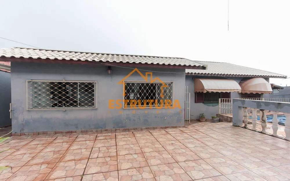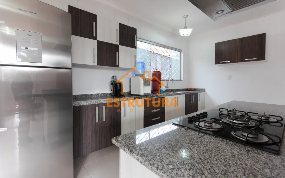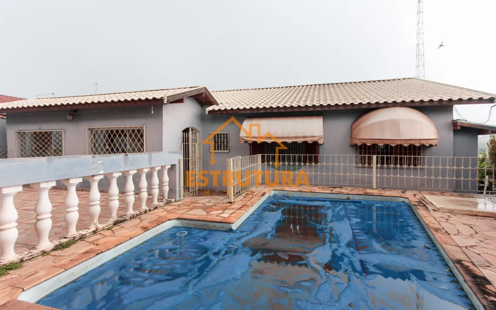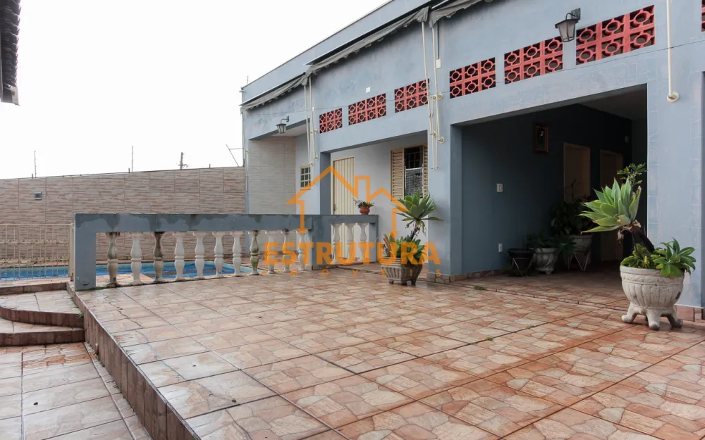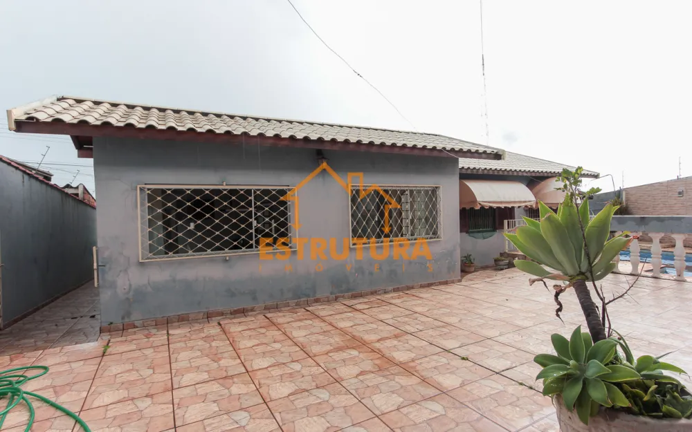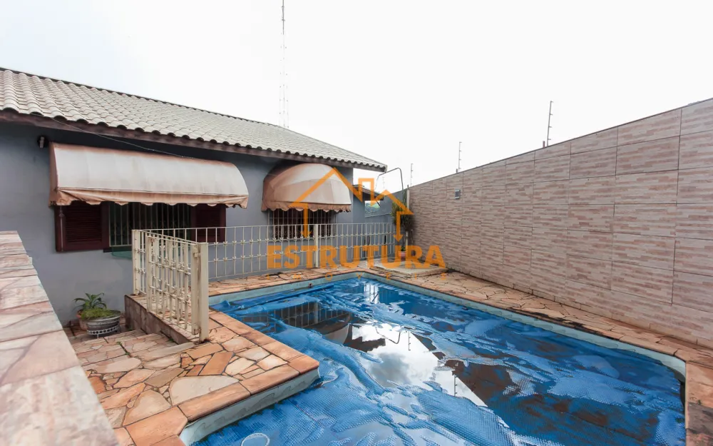 Casa ampla com garagem para 2 carros, sala de TV, banheiro social, cozinha integrada à sala de jantar, 2 quartos incluindo uma suíte, piscina, área de lazer com churrasqueira, quarto de depósito, área de serviço, banheiro adicional e terraço.