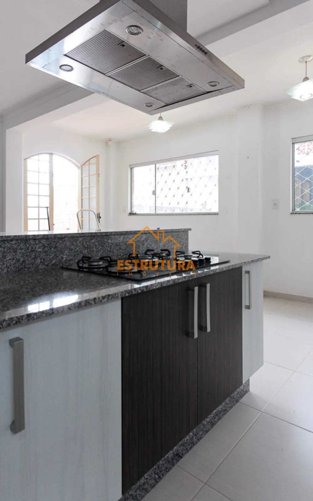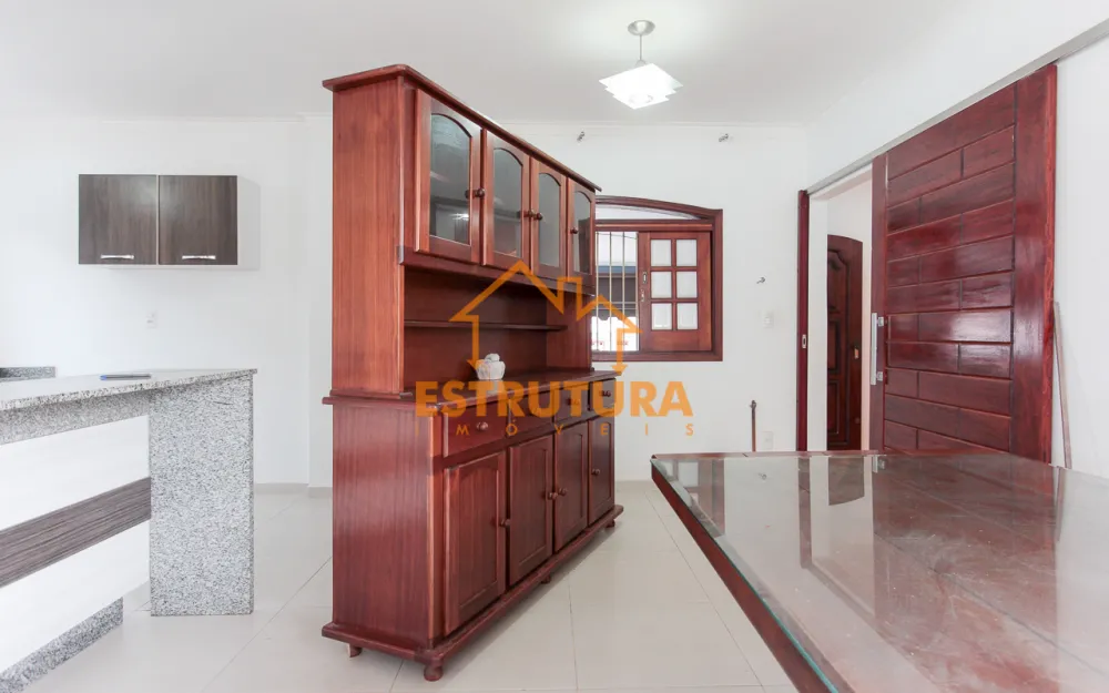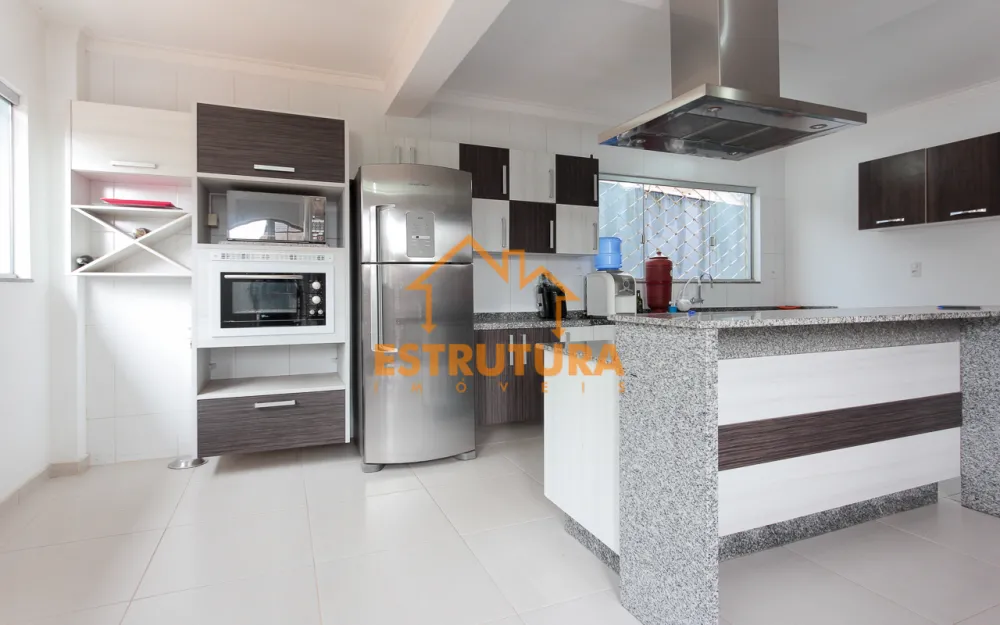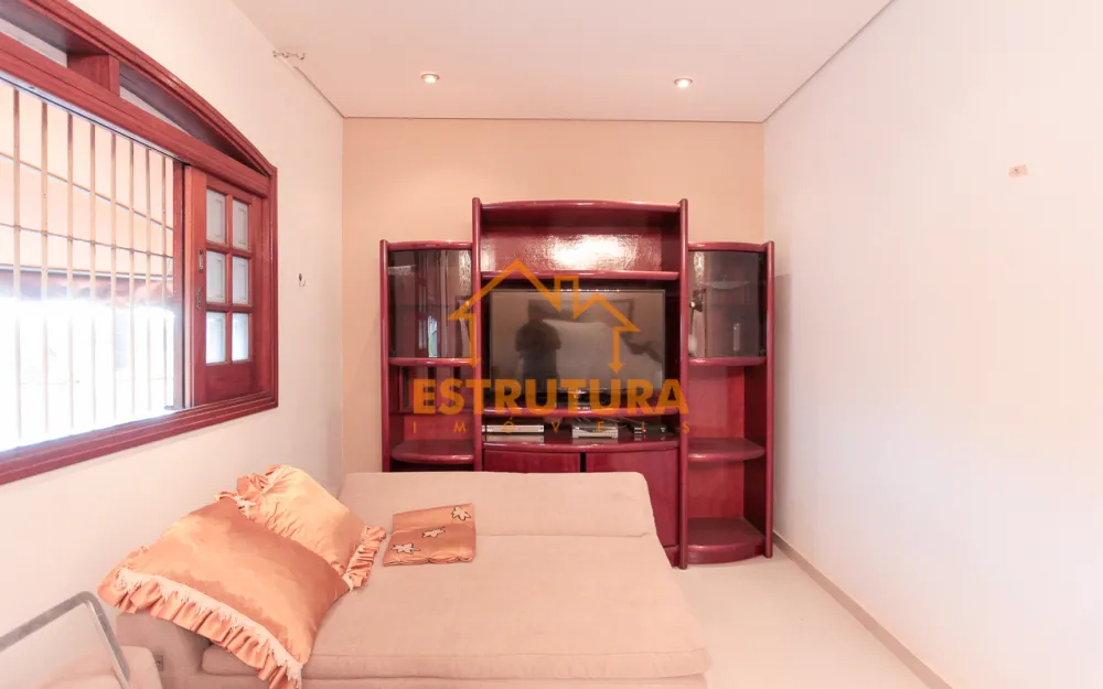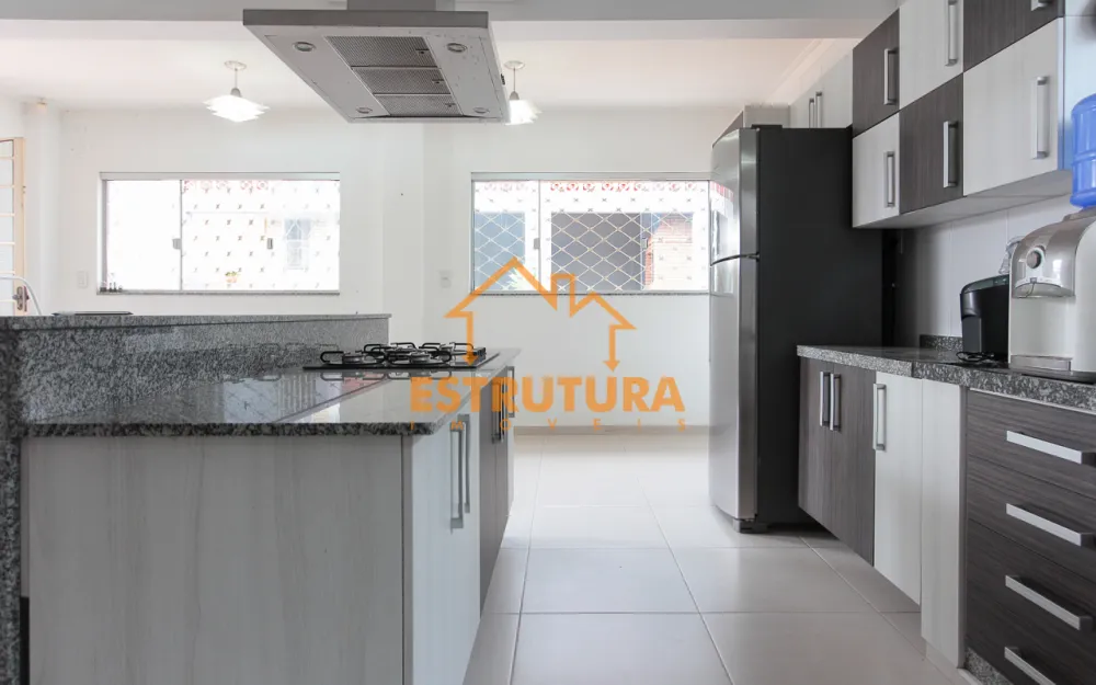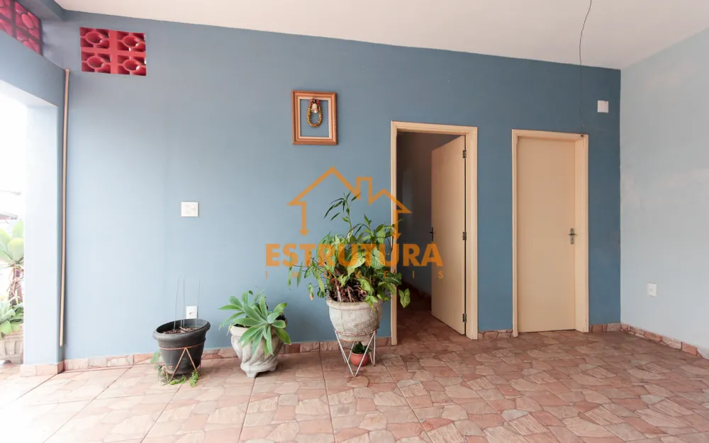 Casa ampla com garagem para 2 carros, sala de TV, banheiro social, cozinha integrada à sala de jantar, 2 quartos incluindo uma suíte, piscina, área de lazer com churrasqueira, quarto de depósito, área de serviço, banheiro adicional e terraço.