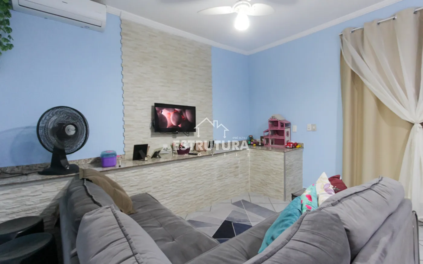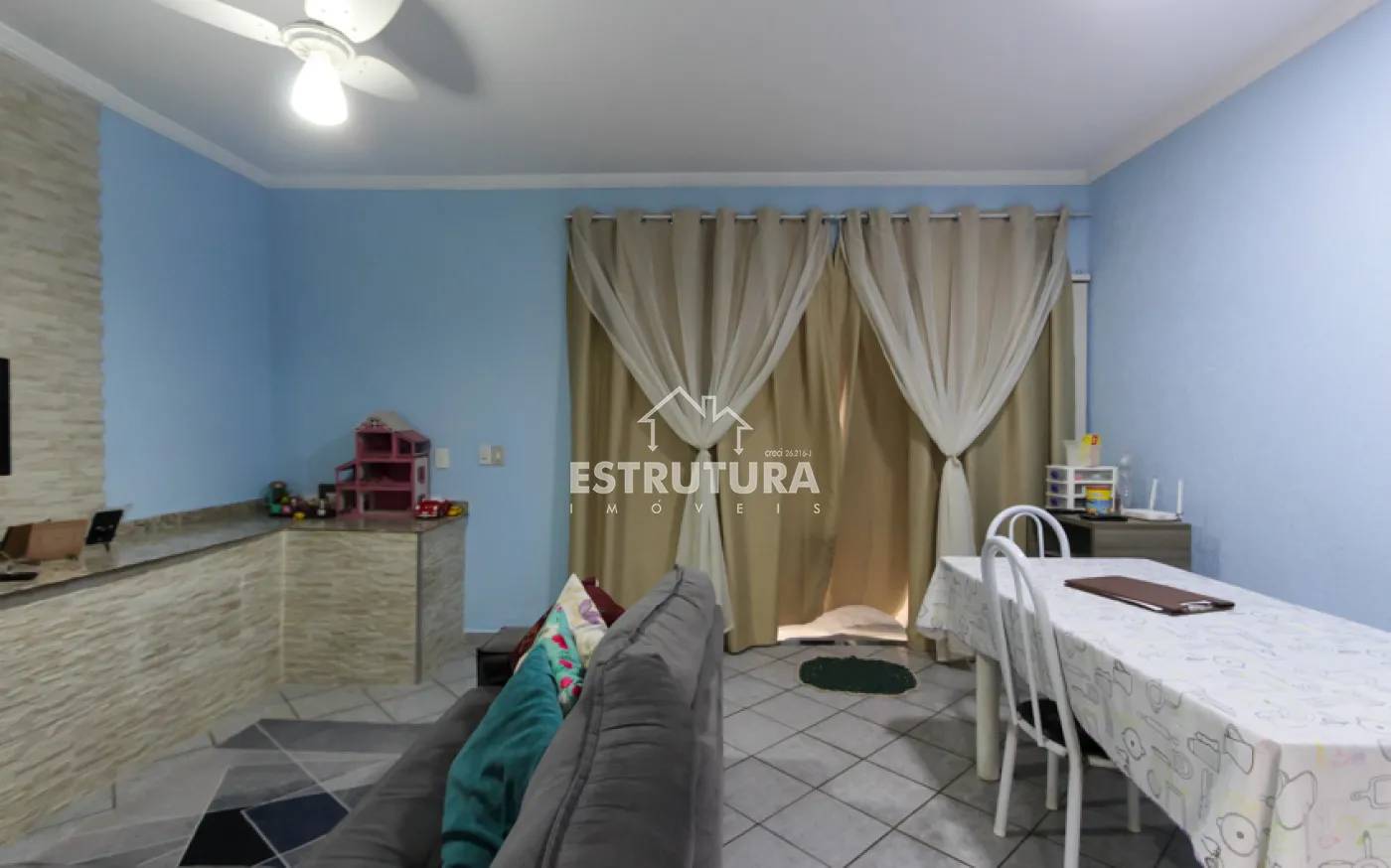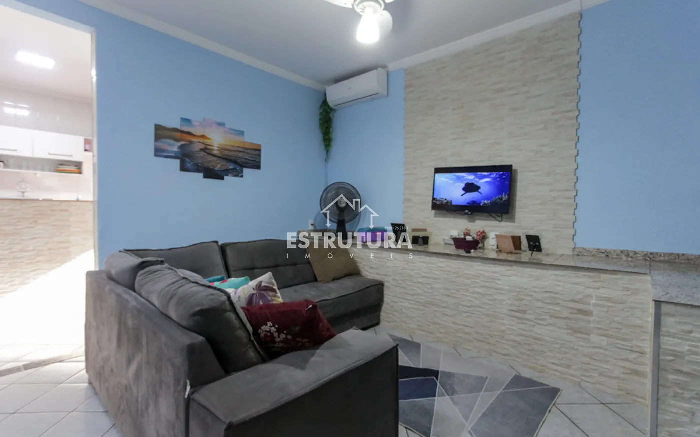 Sala de TV integrada à sala de jantar e cozinha, proporcionando integração com as pessoas no mesmo ambiente, 2 quartos, banheiro social, rancho lateral com churrasqueira, perfeito para momentos de lazer em família, encanamento pronto para ampliação, com possibilidade de transformar o último quarto em suíte.