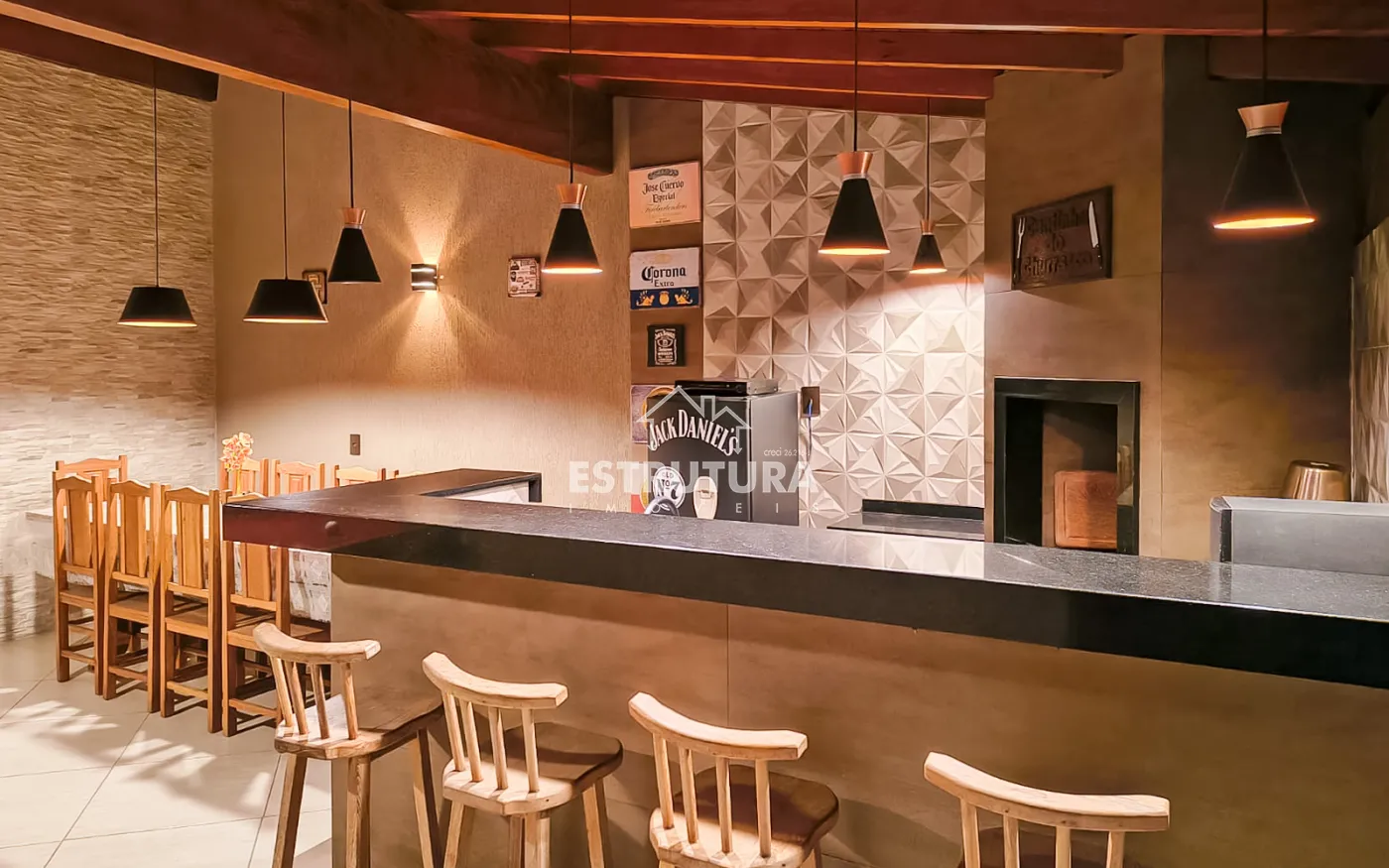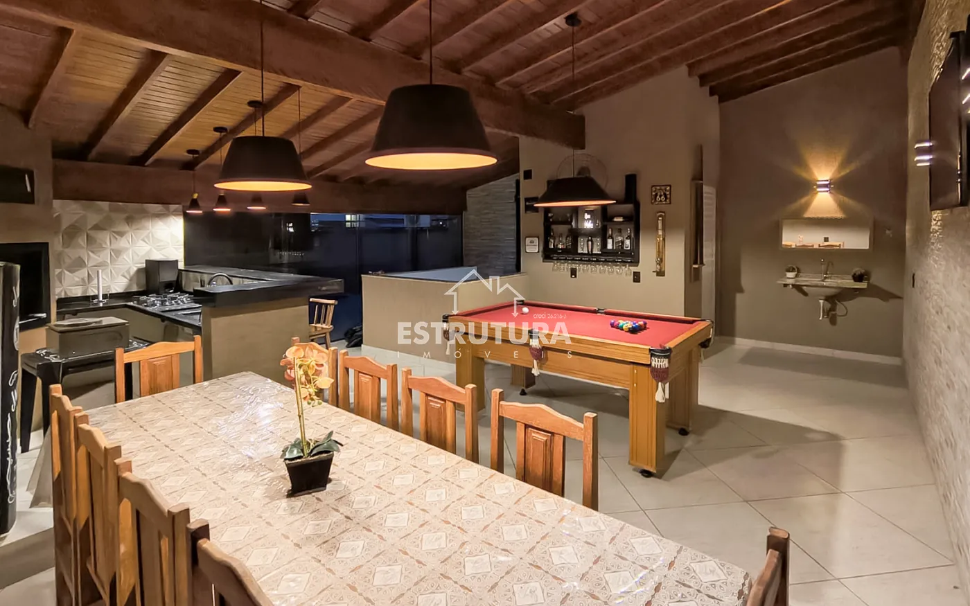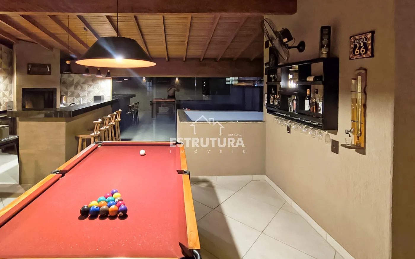 Parte superior: Área gourmet, 52 m² com churrasqueira, balcão com área aberta, mesa de sinuca, mesa de madeira maciça para 10 lugares e cooktop.