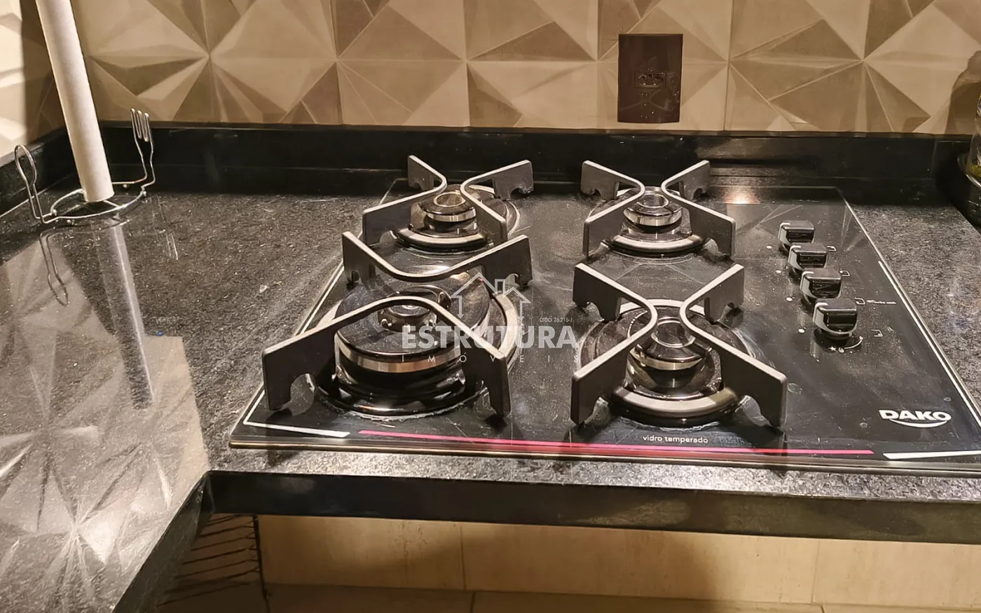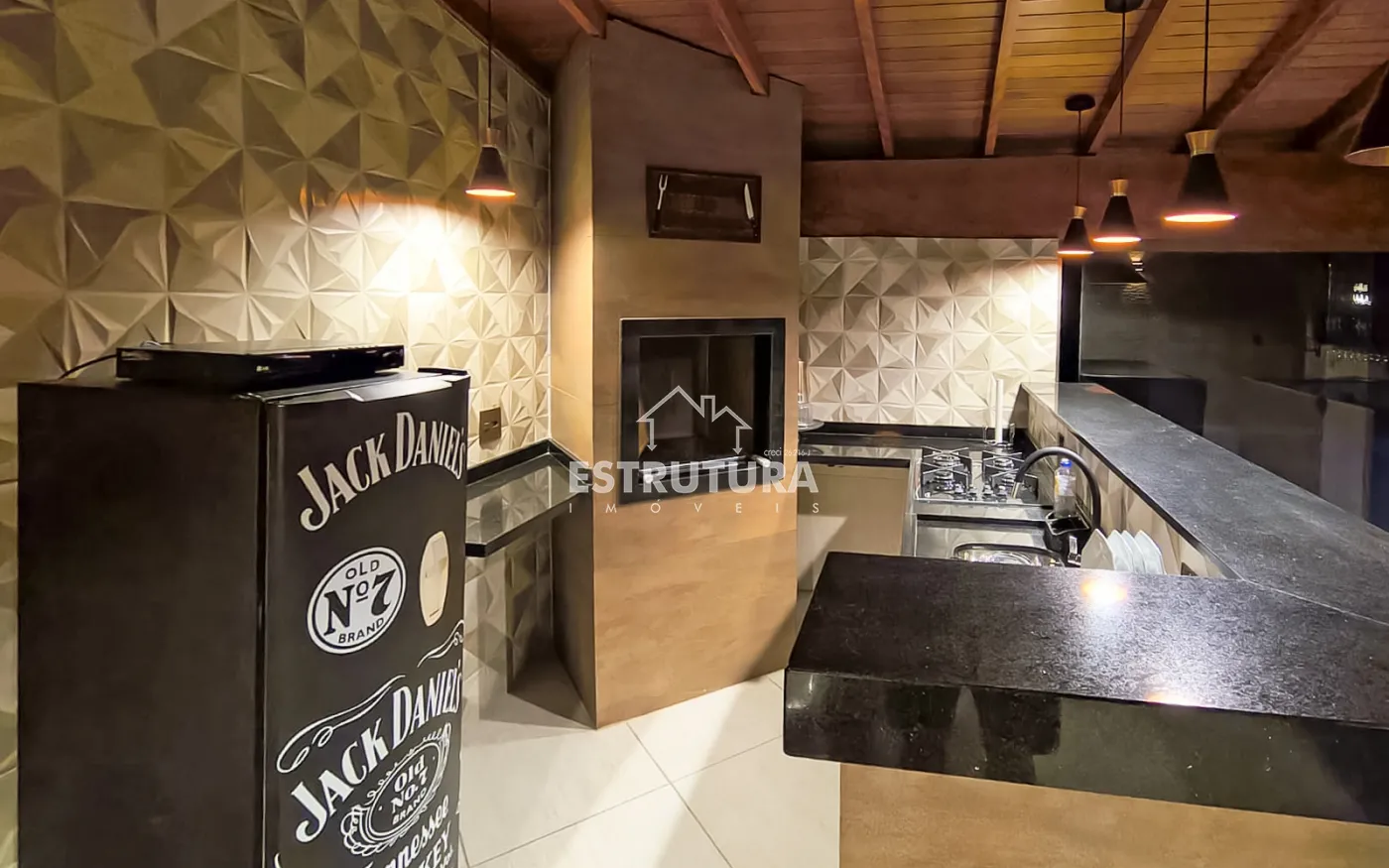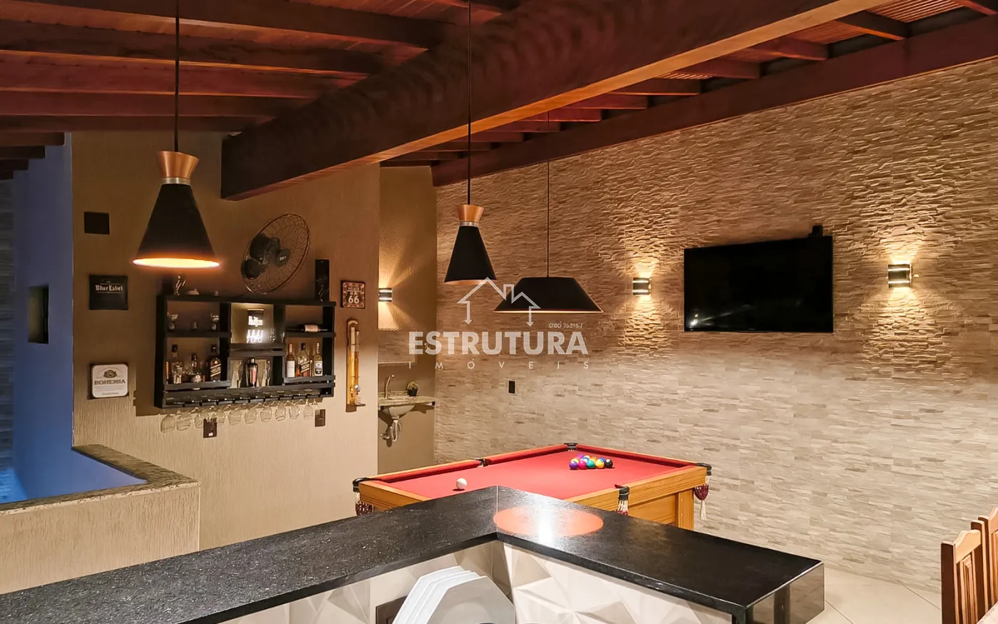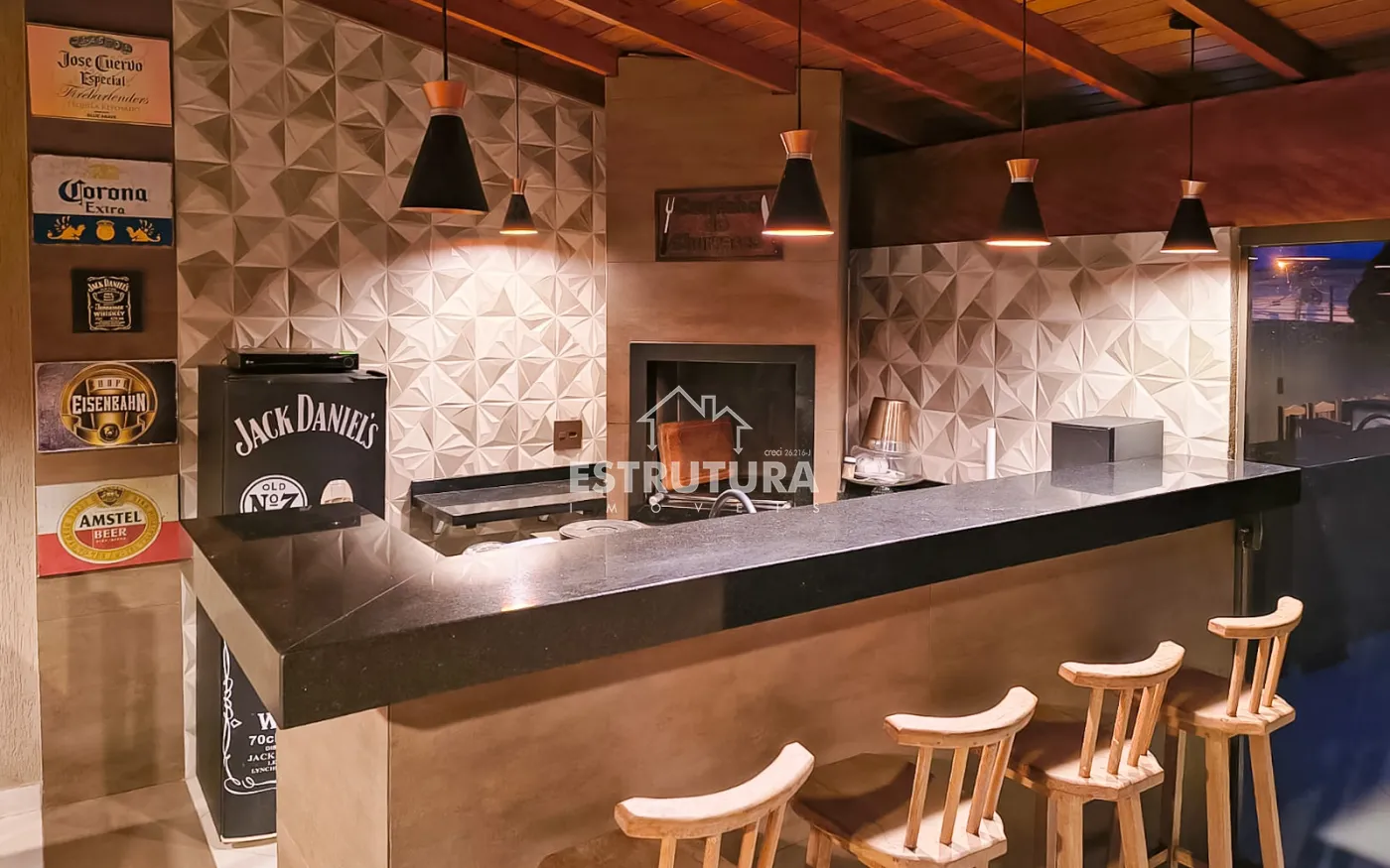 Parte superior: Área gourmet, 52 m² com churrasqueira, balcão com área aberta, mesa de sinuca, mesa de madeira maciça para 10 lugares e cooktop.