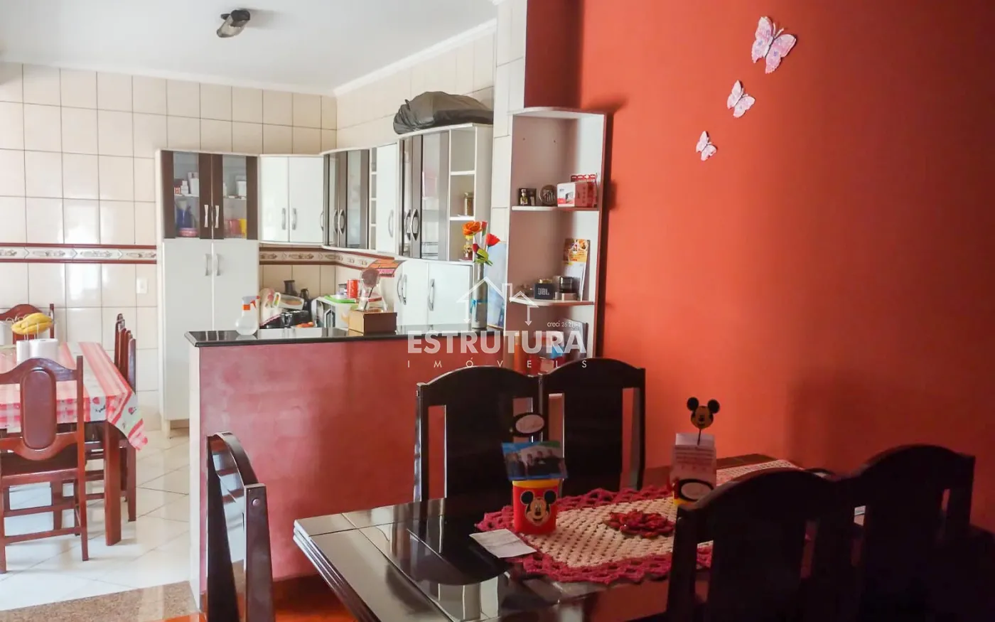 1 piso : Garagem para 2 carros coberto com portão eletrônico, Hall de visita, 2 dormitórios, banheiro social, sala de jantar e cozinha