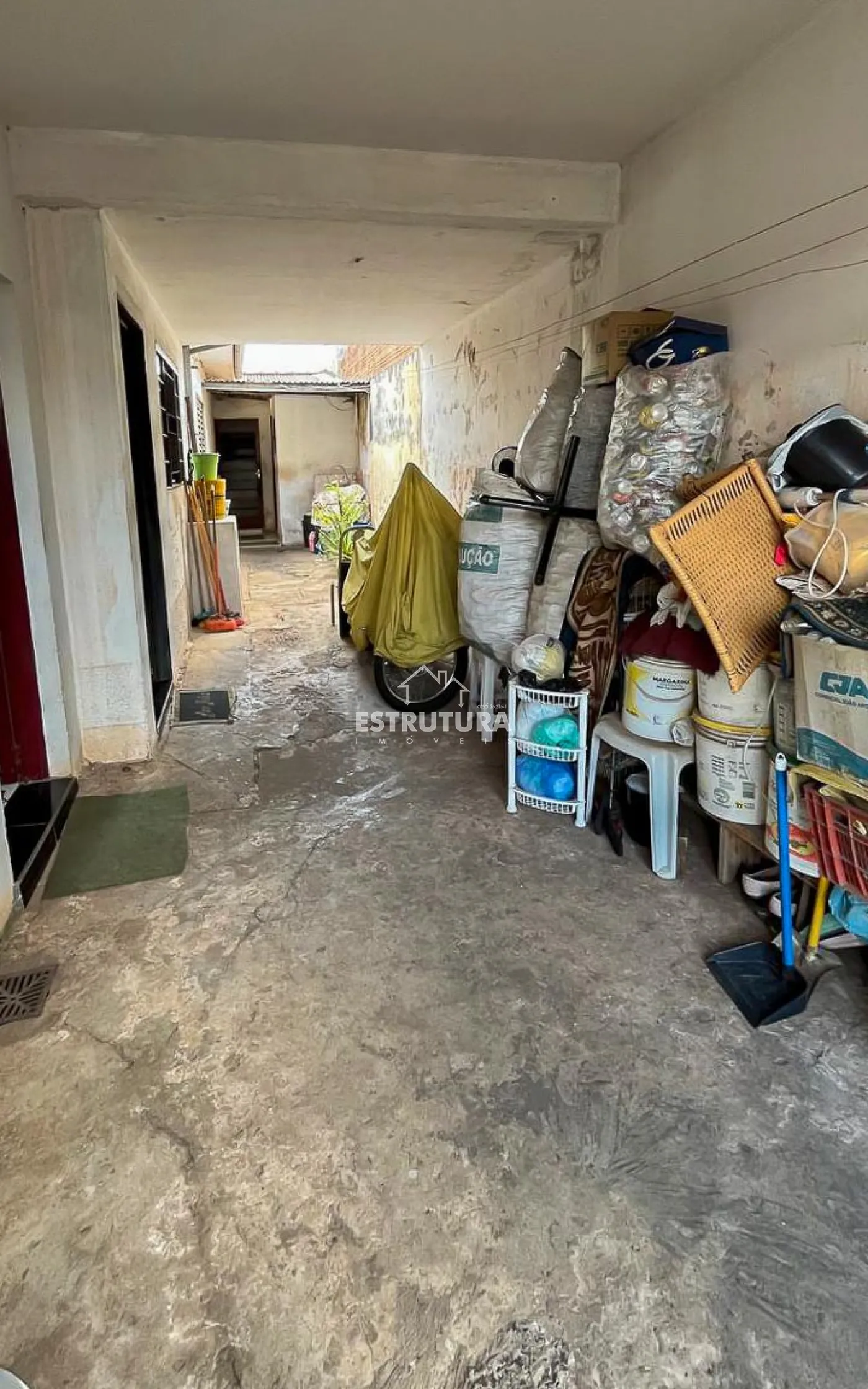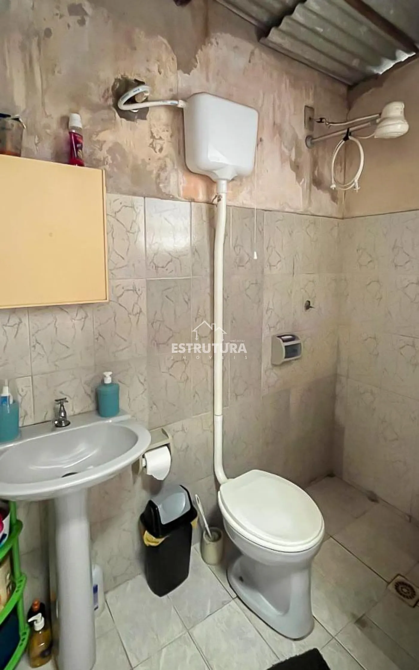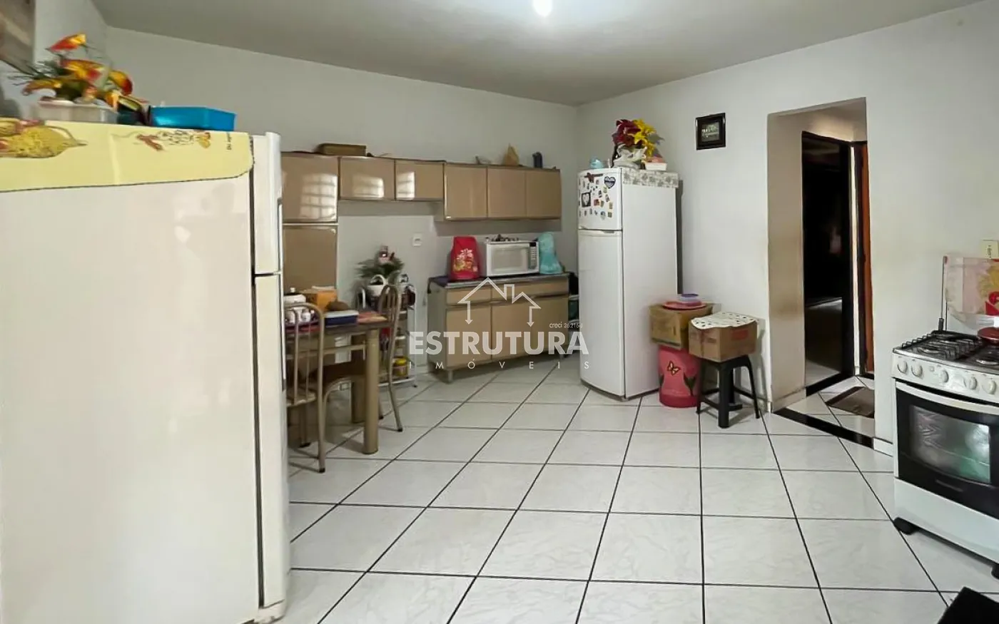 Sobrado com sala, ampla cozinha, 01 banheiro social, 2 quartos e garagem para 2 carros na parte inferior. Na parte superior, há 3 quartos. Aos fundos, existe uma área de serviço e uma edícula para reforma, contendo mais 2 cômodos e 1 banheiro.