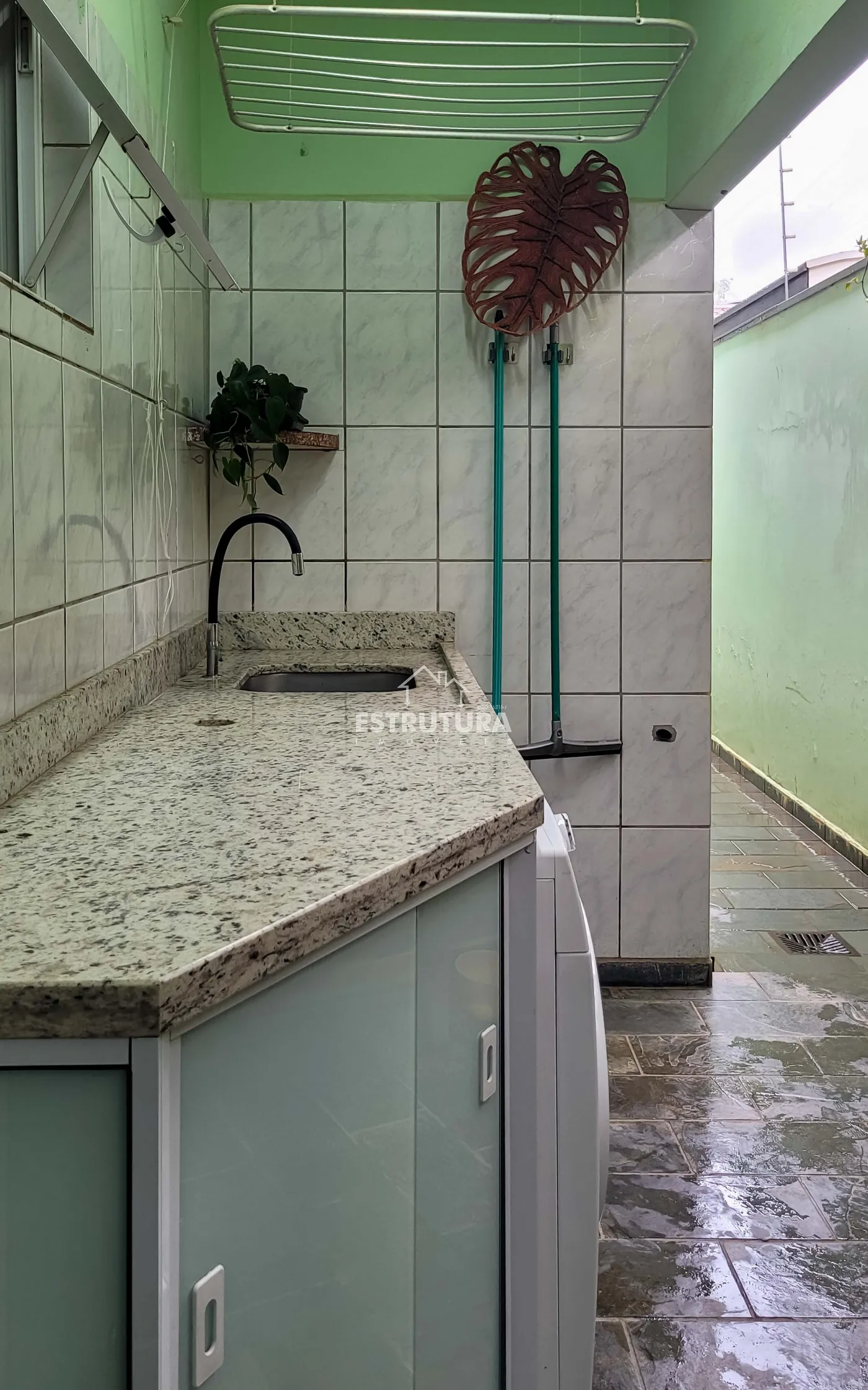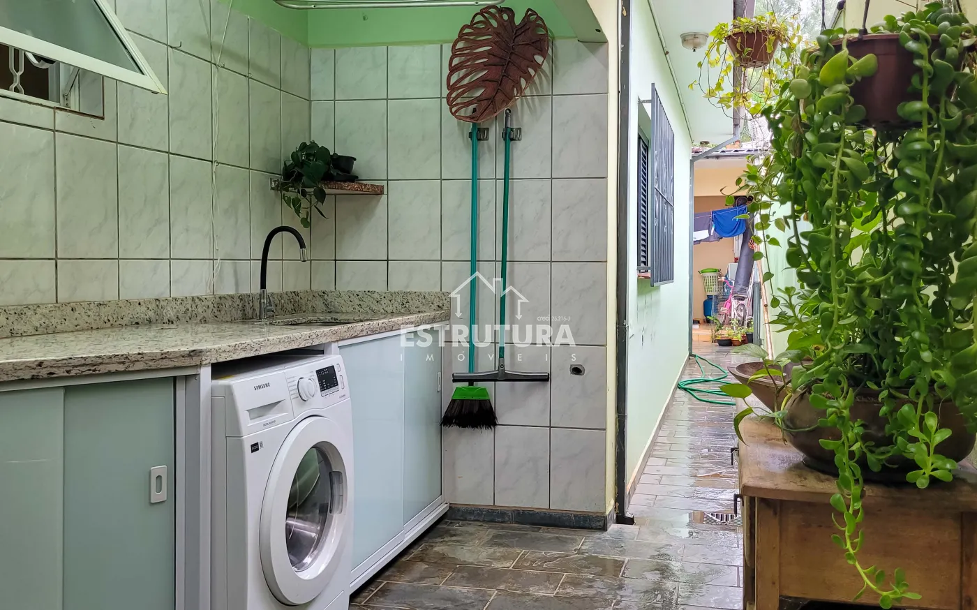 Na área externa, o imóvel conta com quarto e um banheiro, espaço de trabalho ou apoio, além de lavanderia coberta.
