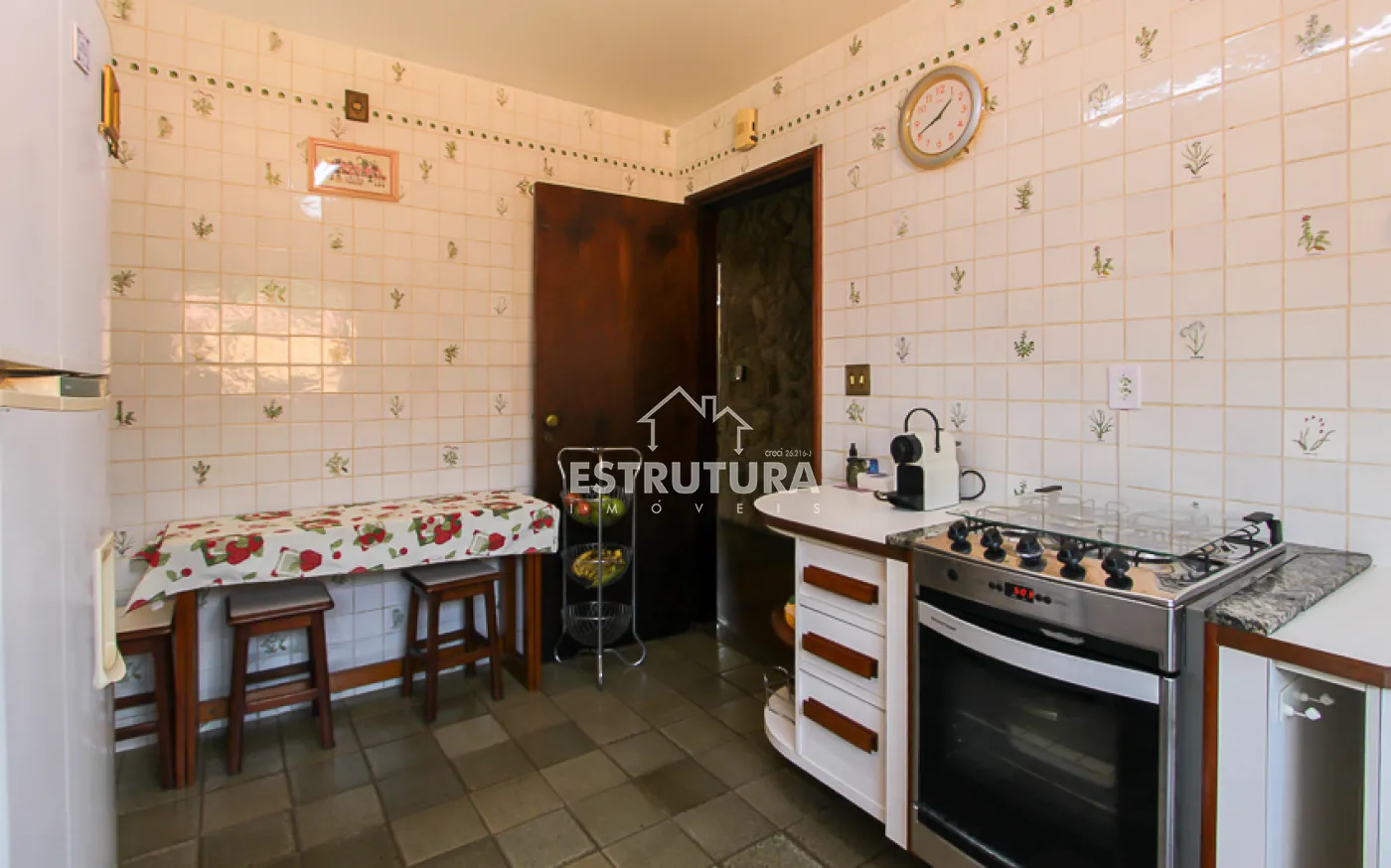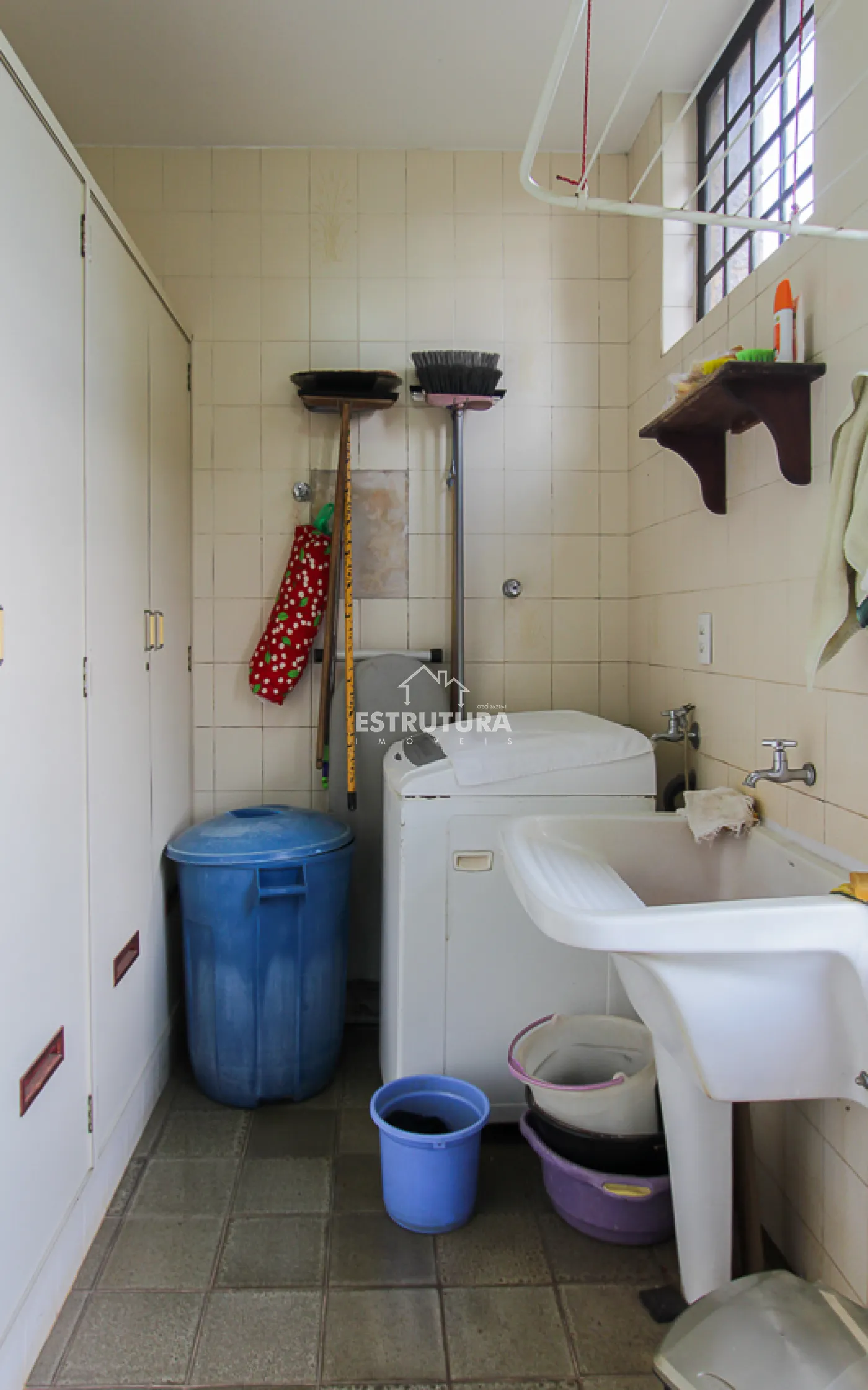 Piso inferior: sala de estar, sala de jantar, lavabo, sala de descanso, cozinha planejada, e lavanderia com armários, amplo quintal, garagem para vários carros, quarto de despejo, banheiro externo, e churrasqueira.