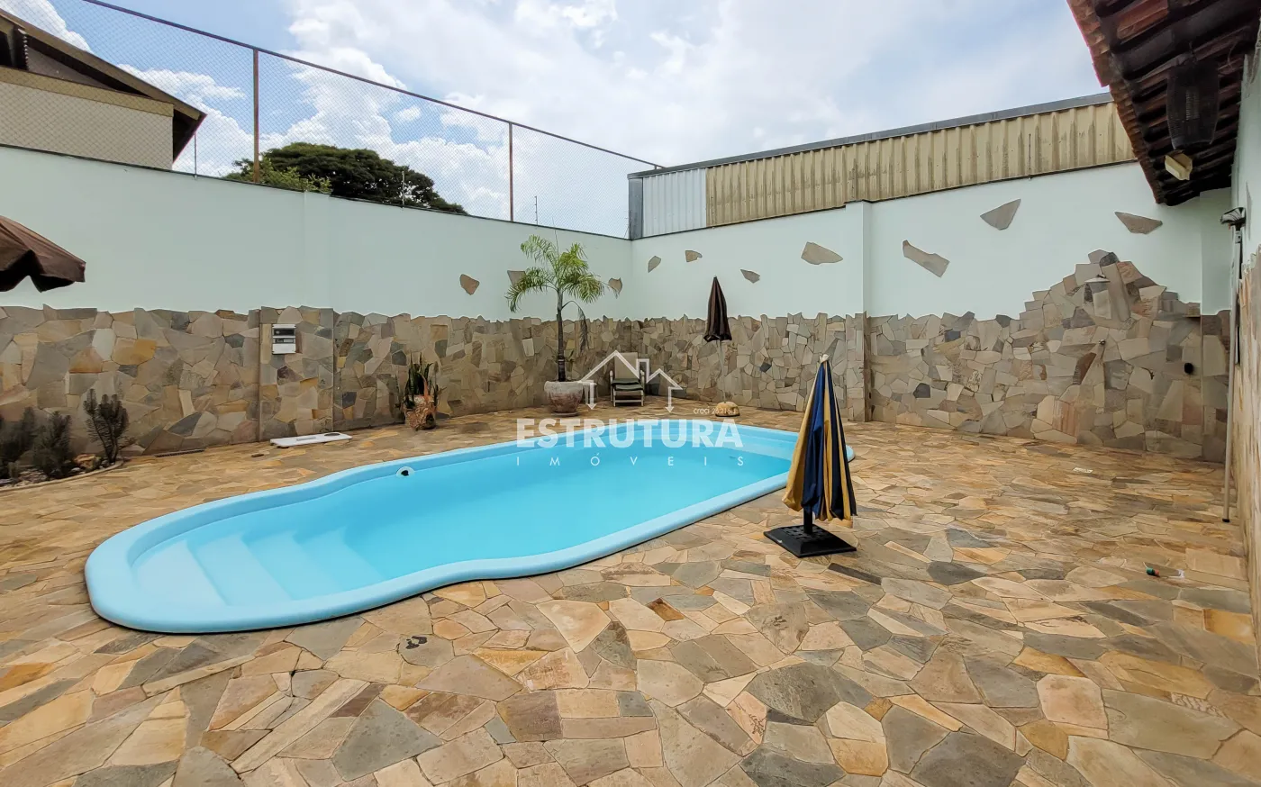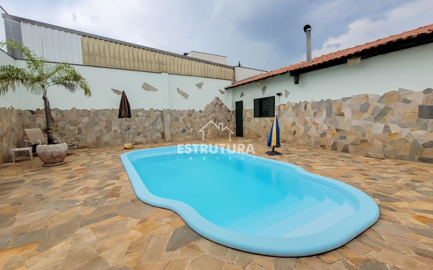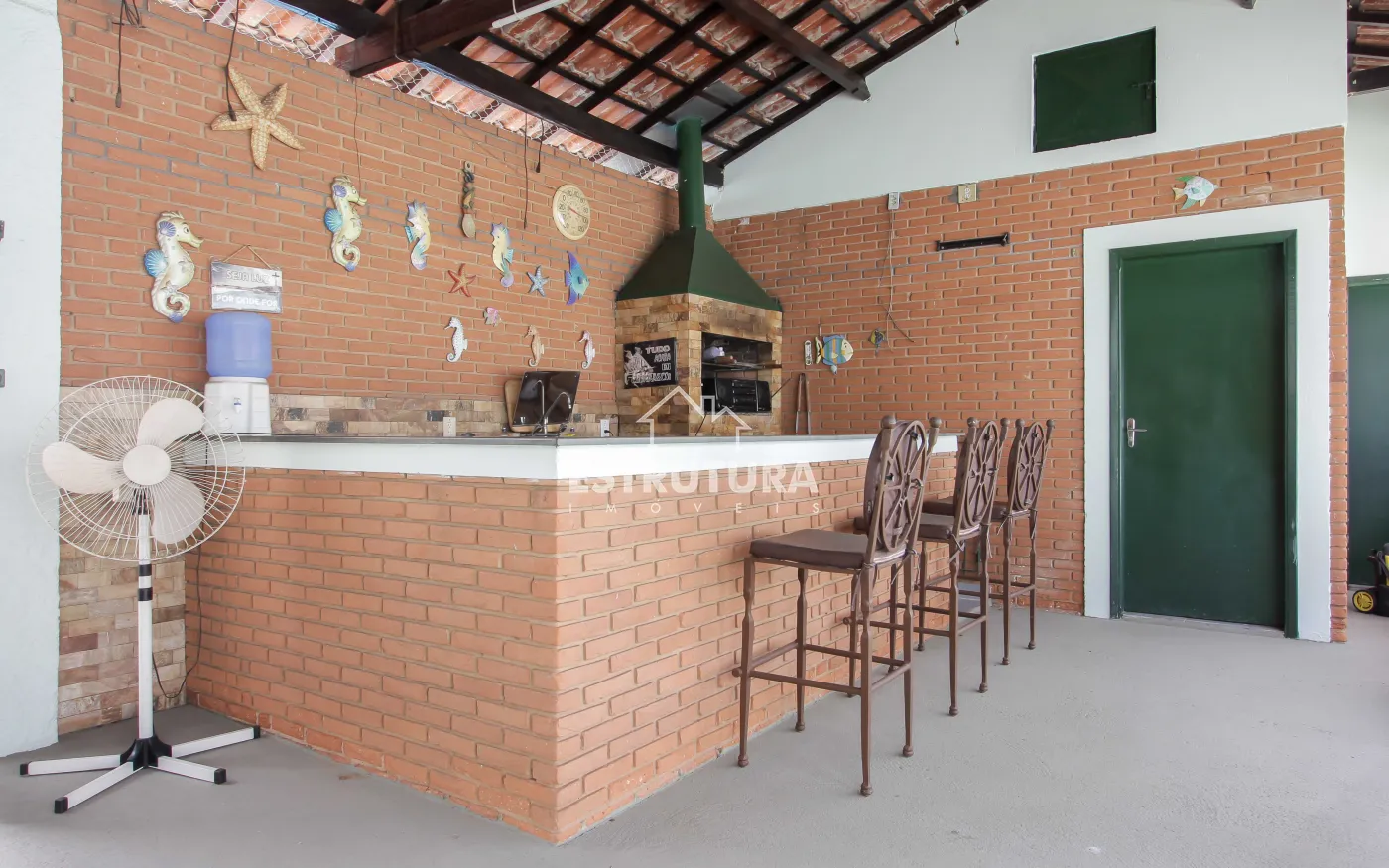 Nos fundos, há um amplo quintal com área gourmet, banheiro, dormitório e uma belíssima piscina. A casa possui 4 placas solares, água quente em toda a casa, exceto na piscina, e 8 câmeras de segurança com DVR.