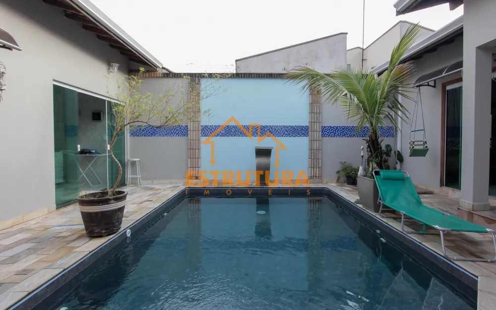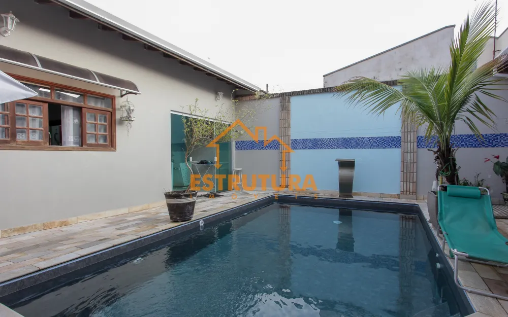 Área de lazer com piscina, ducha, cozinha com planejados e churrasqueiras, 01 banheiro e 01 dormitório