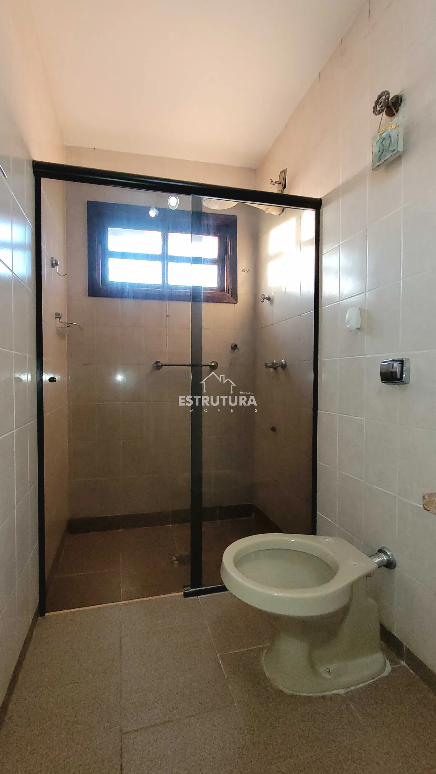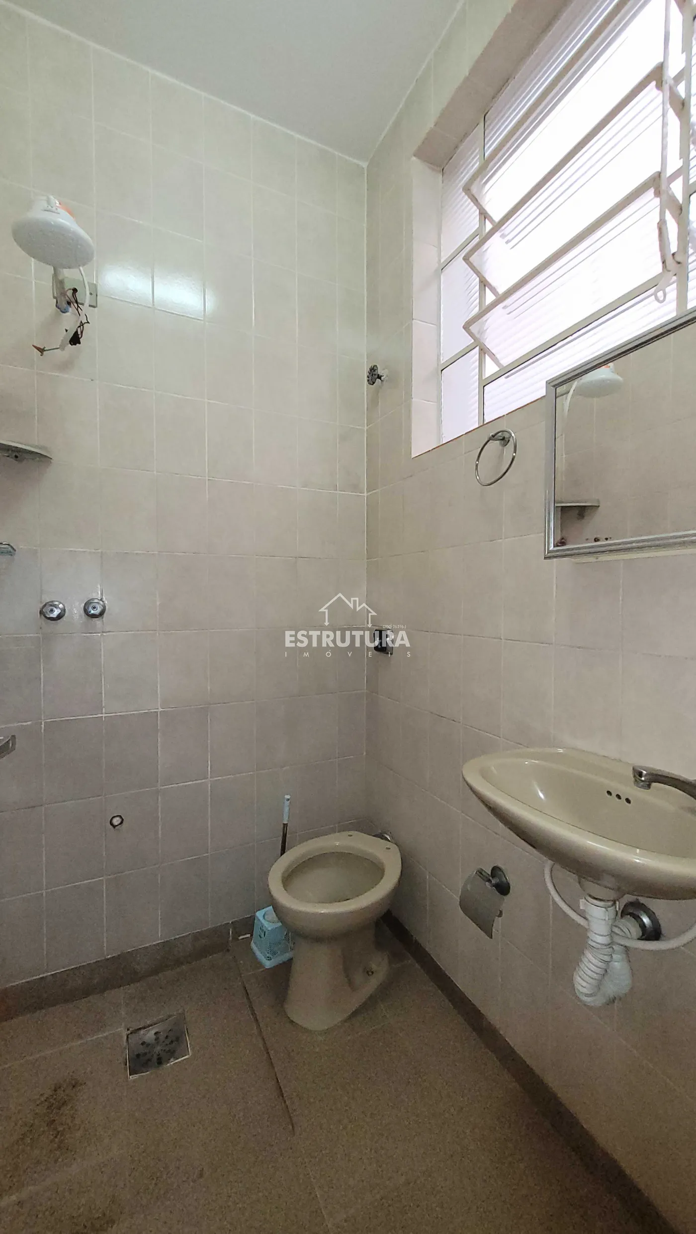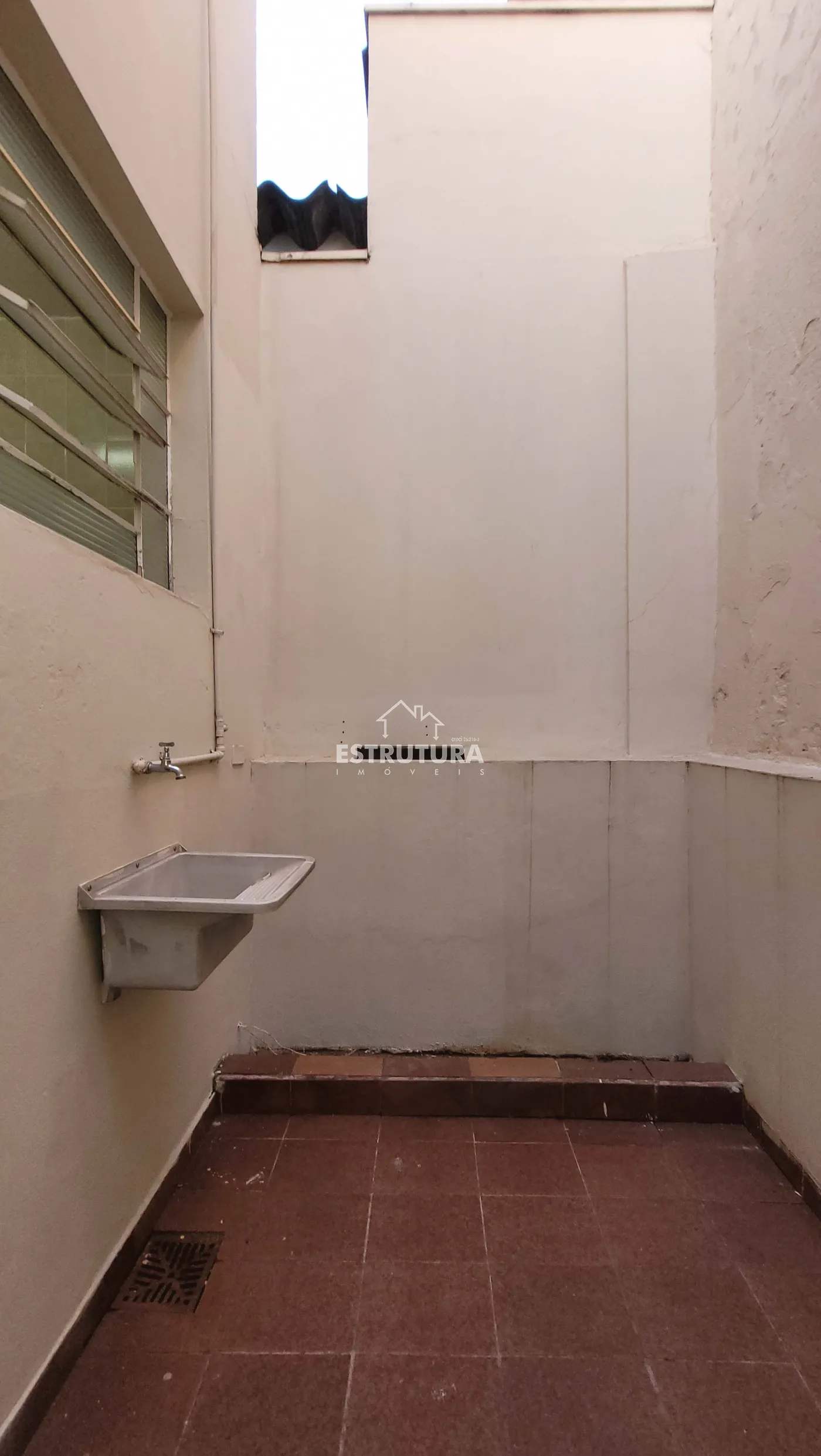 Casa no centro, com 2 garagens, 1 dormitório (suíte com armário), e cozinha integrada à sala de jantar.