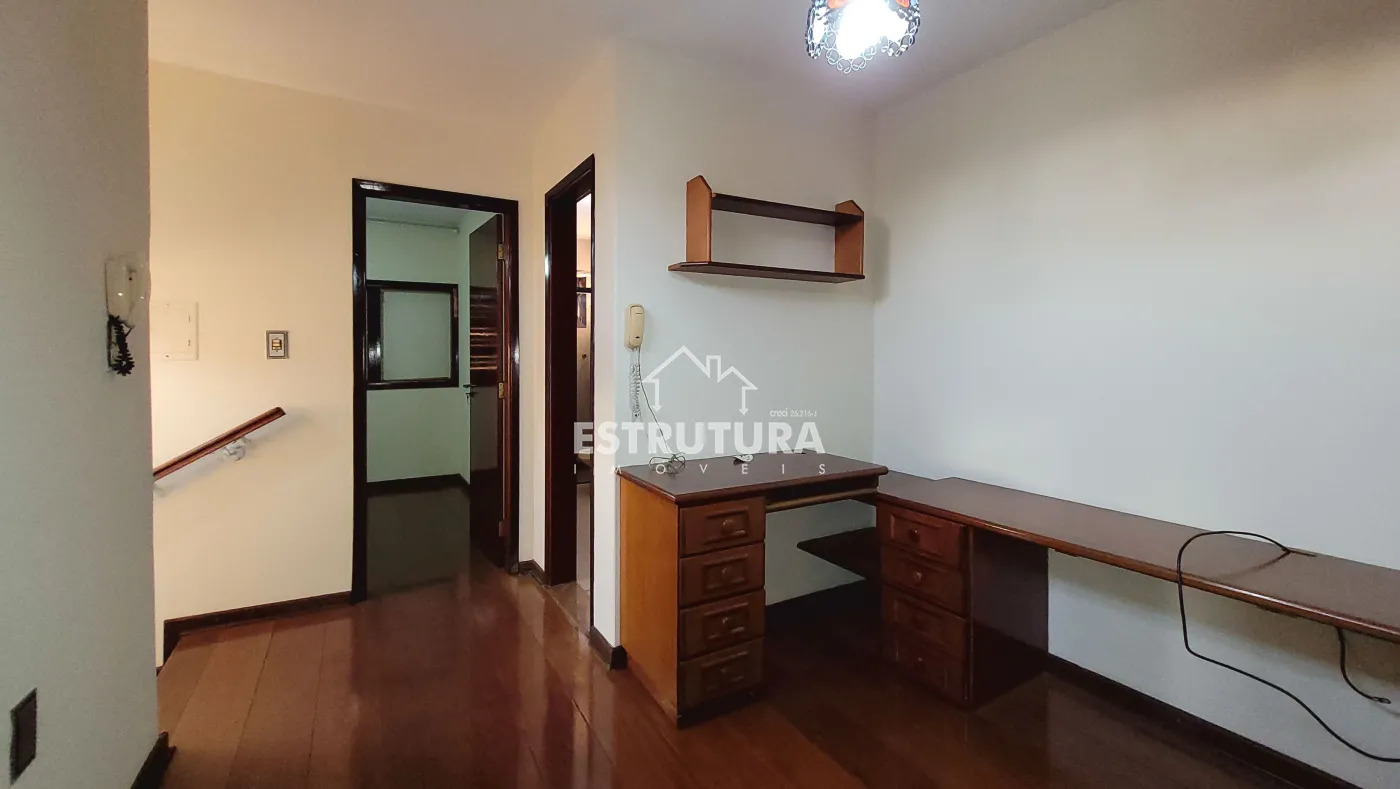 No piso superior, conta com 2 dormitórios, banheiro, escritório e área de lazer com piscina, churrasqueira e 2 banheiros. Ao lado, há um salão com banheiro.