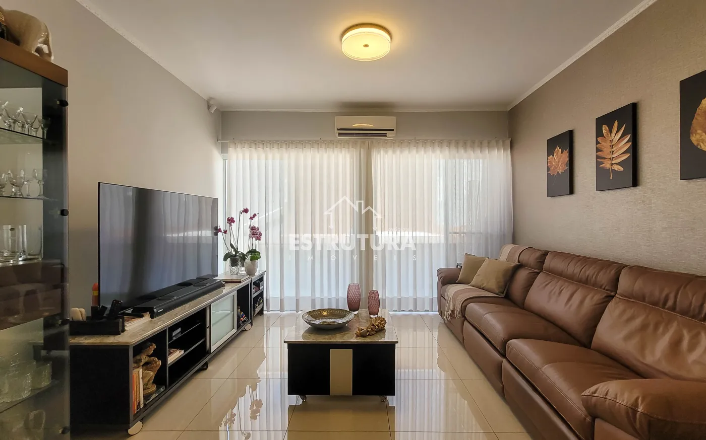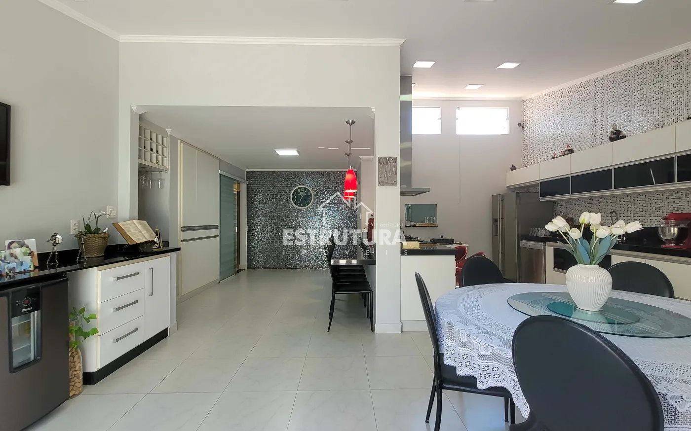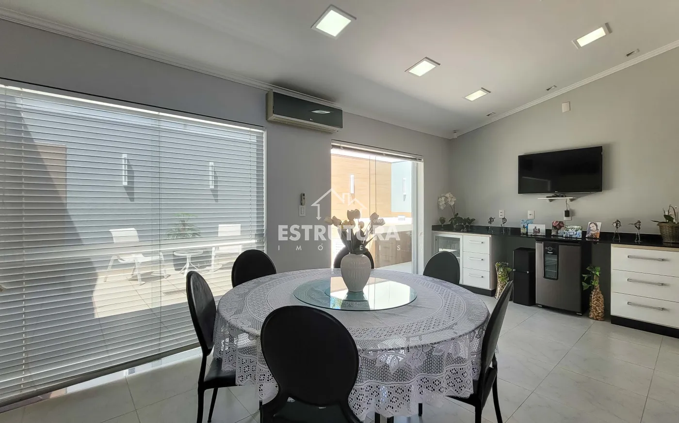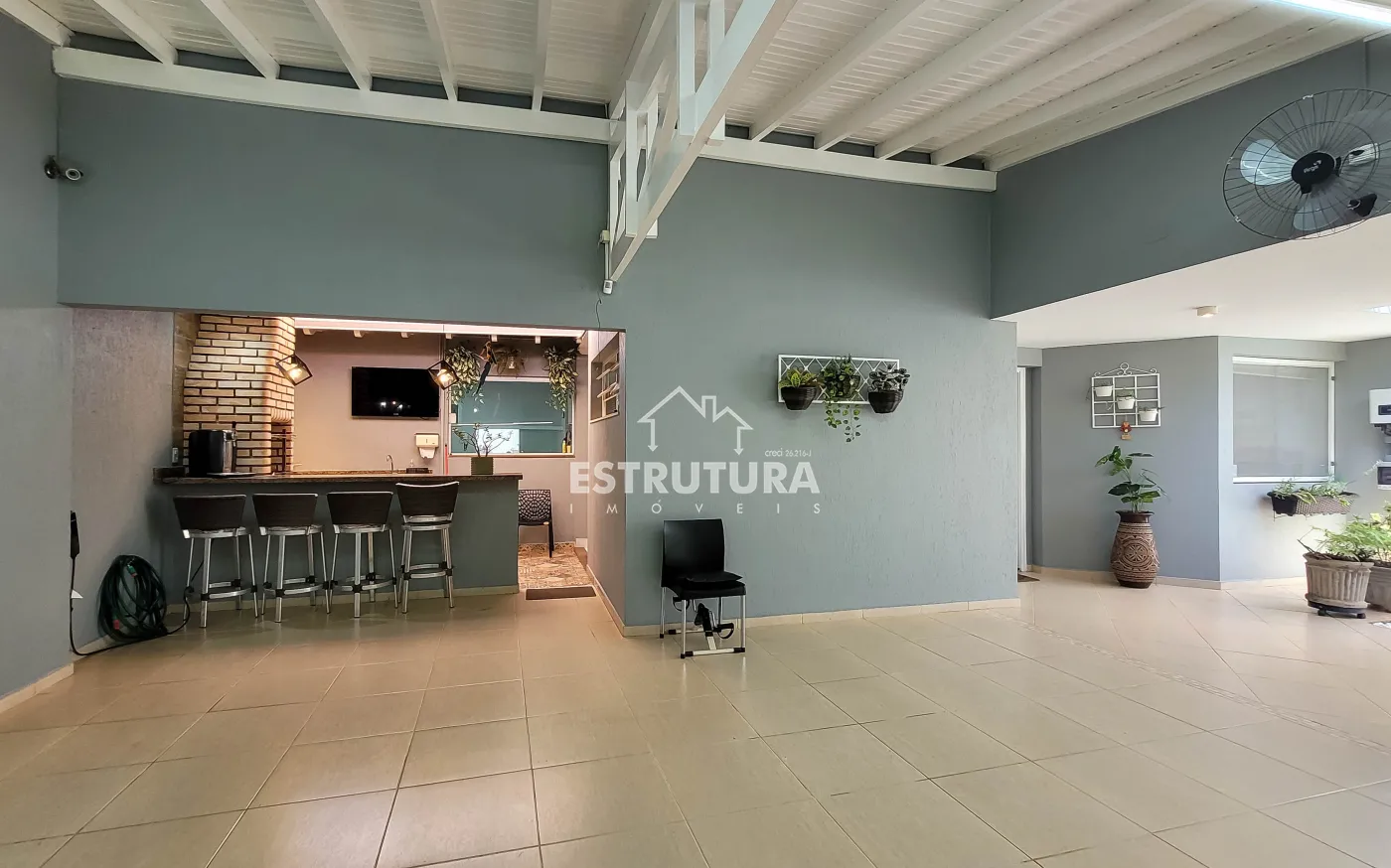 - Salas: sala de estar com rack e papel de parede, e sala de jantar também decorada com papel de parede. Ambas contam com ventiladores de teto e preparação para ar-condicionado.