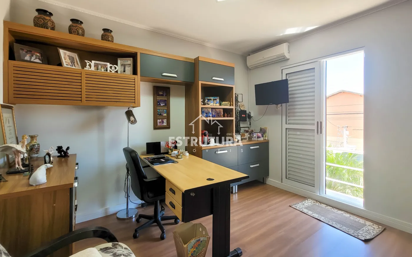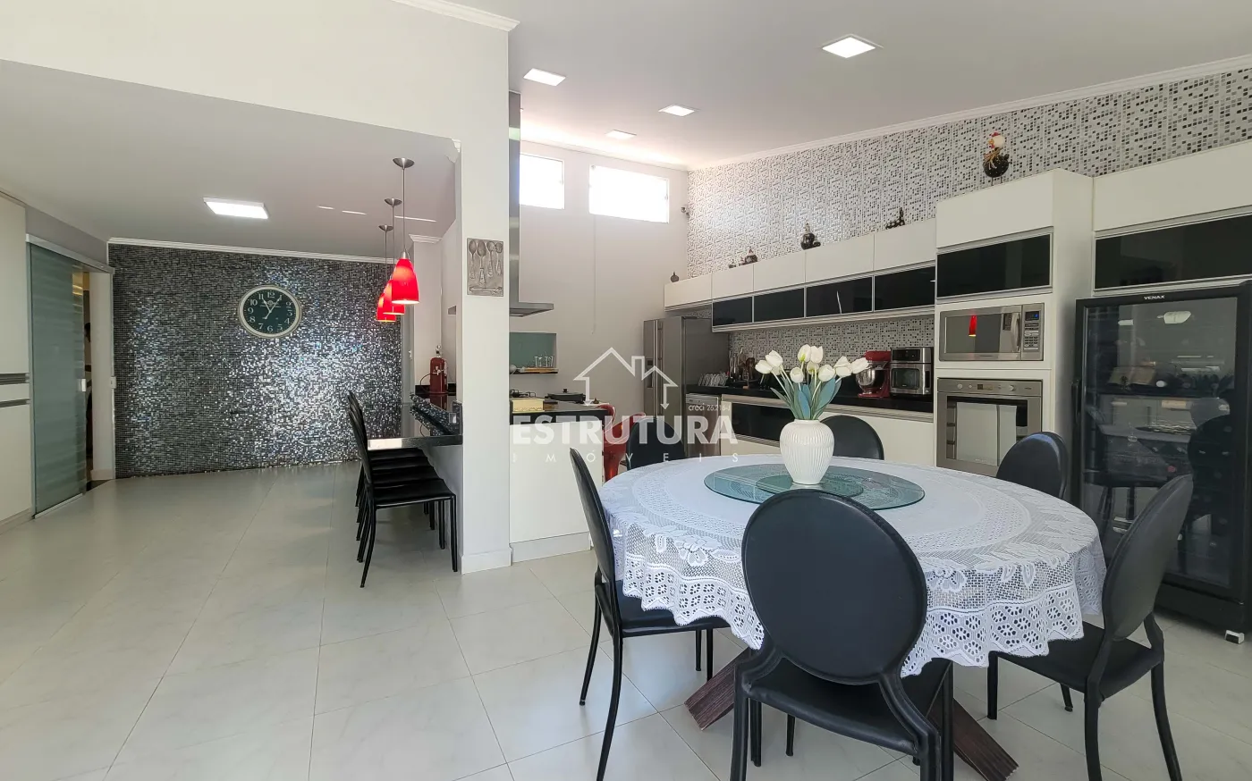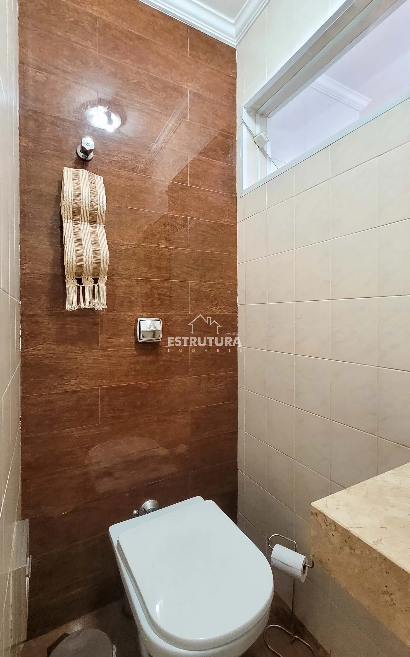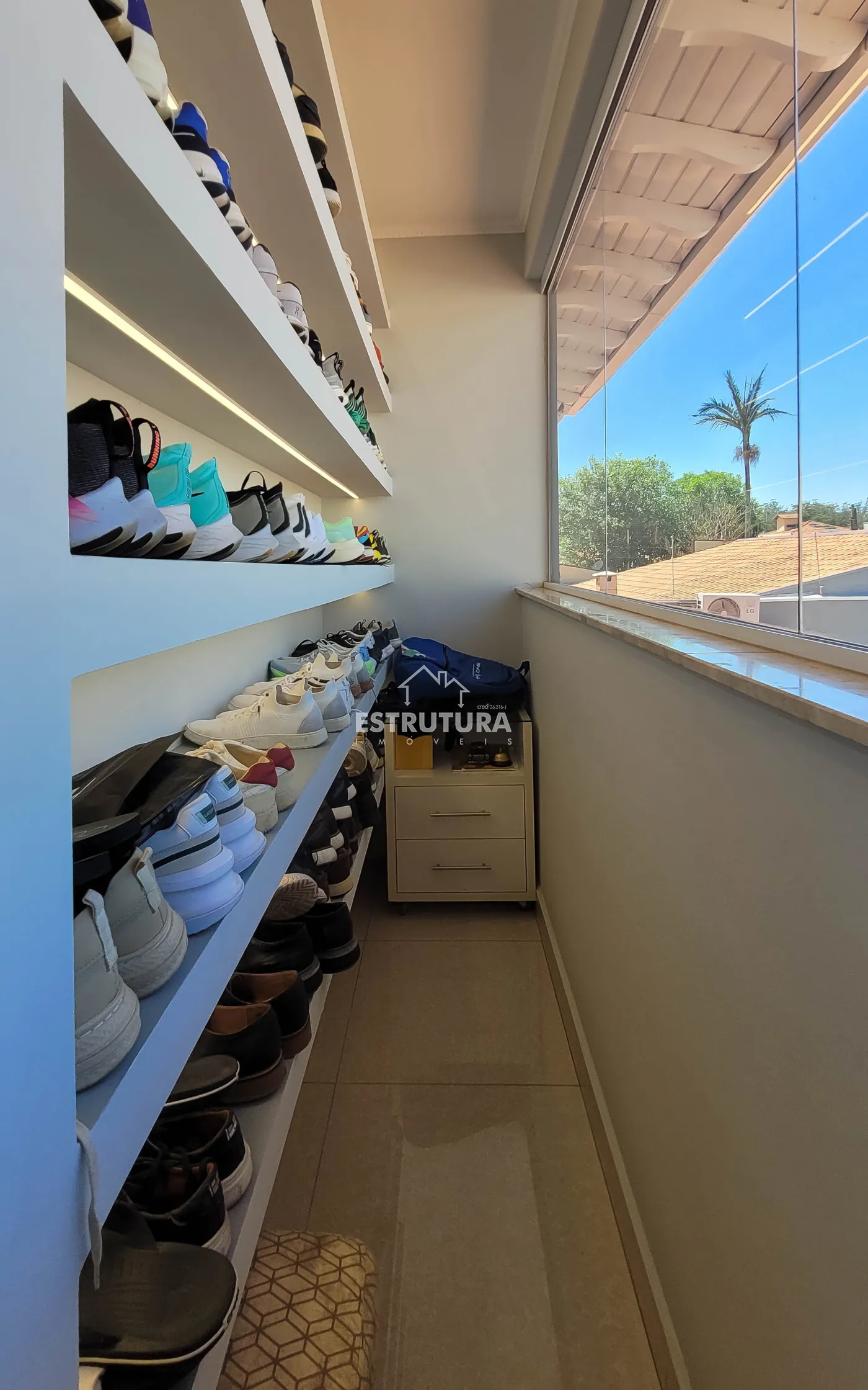 - Salas: sala de estar com rack e papel de parede, e sala de jantar também decorada com papel de parede. Ambas contam com ventiladores de teto e preparação para ar-condicionado.