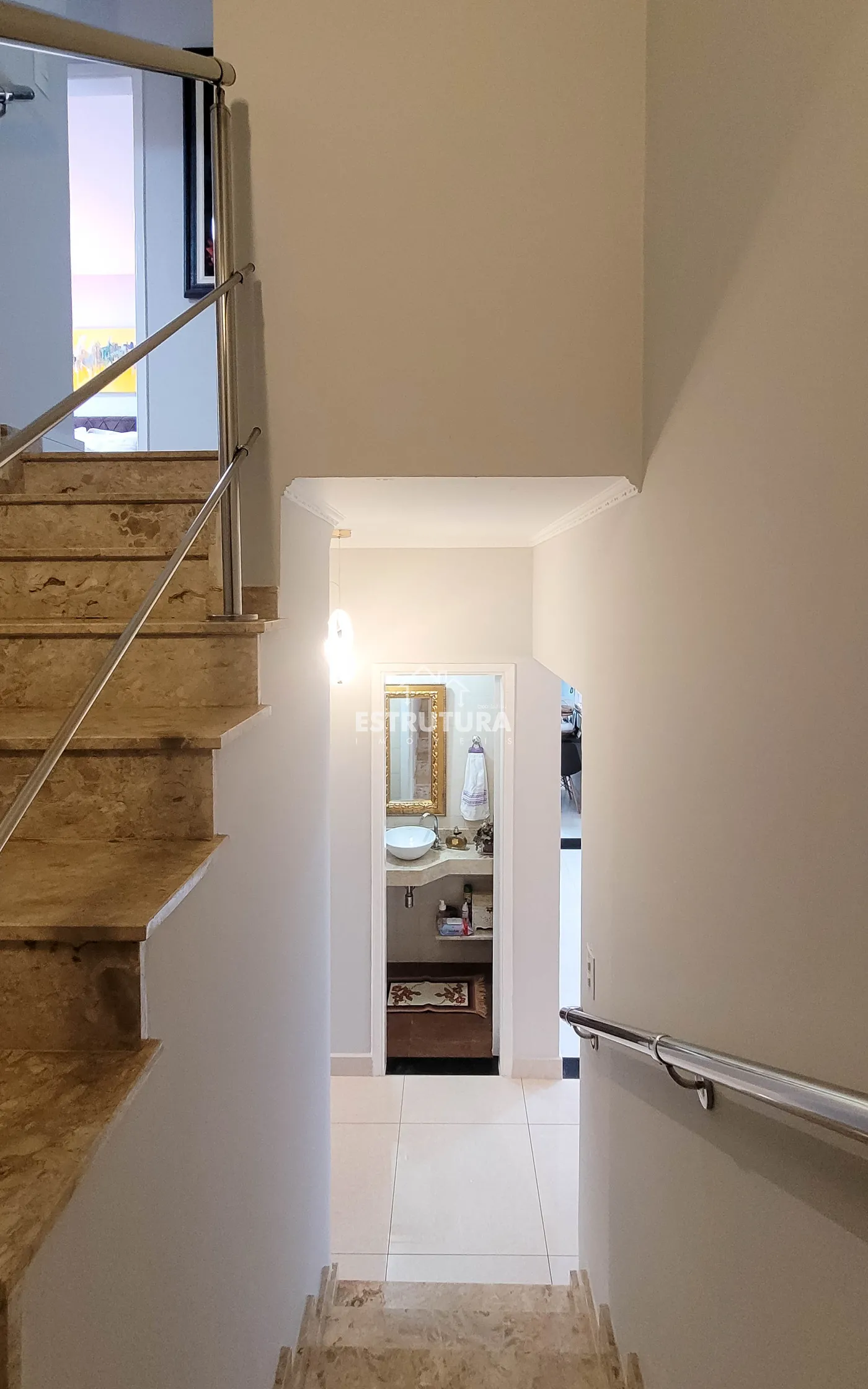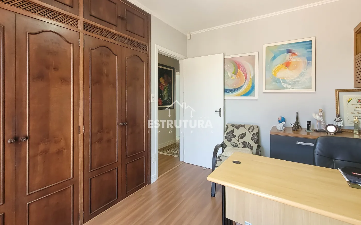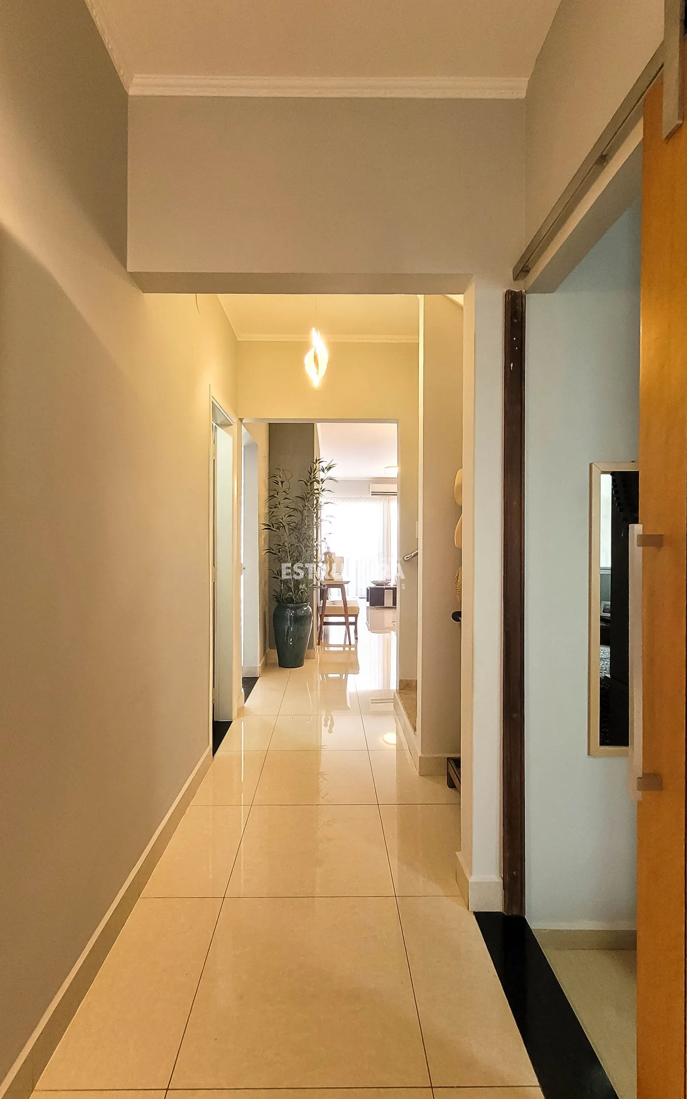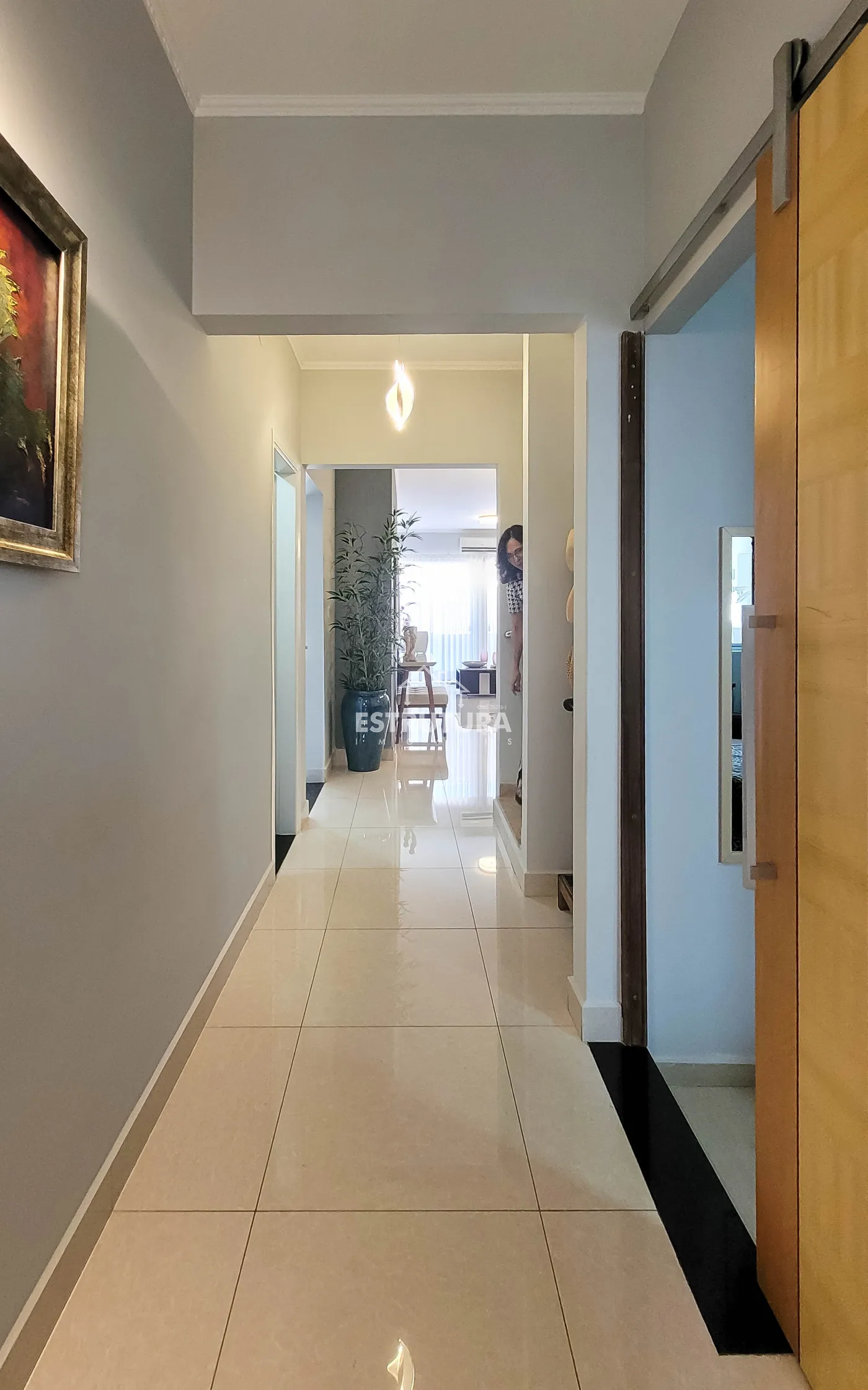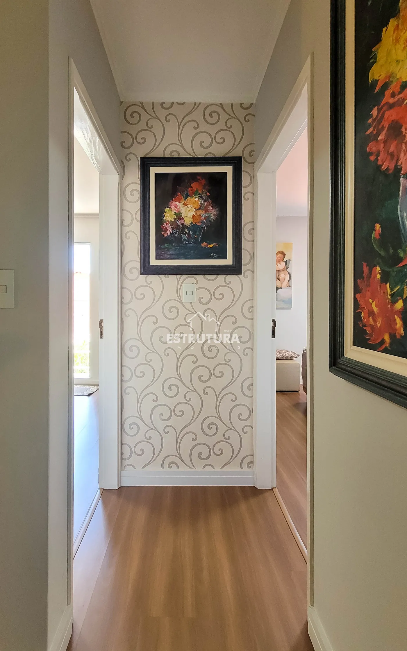 - Hall de entrada/escritório: decorado com papel de parede e lustre de cristal.