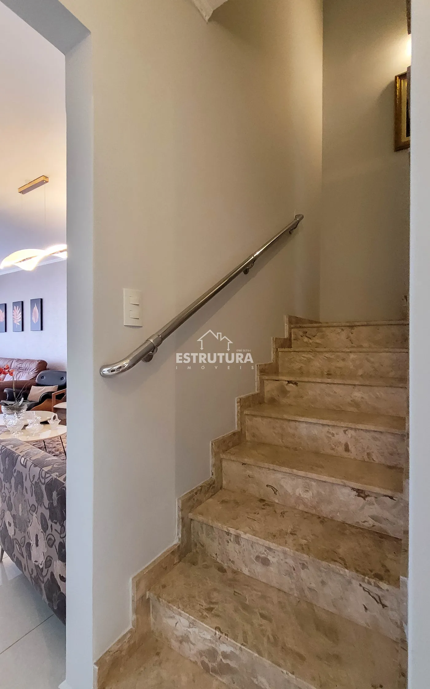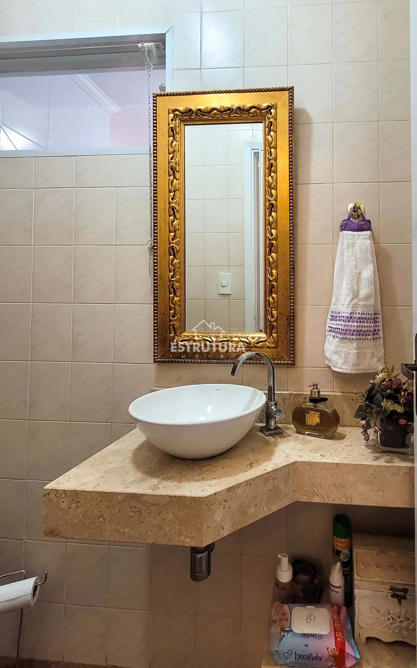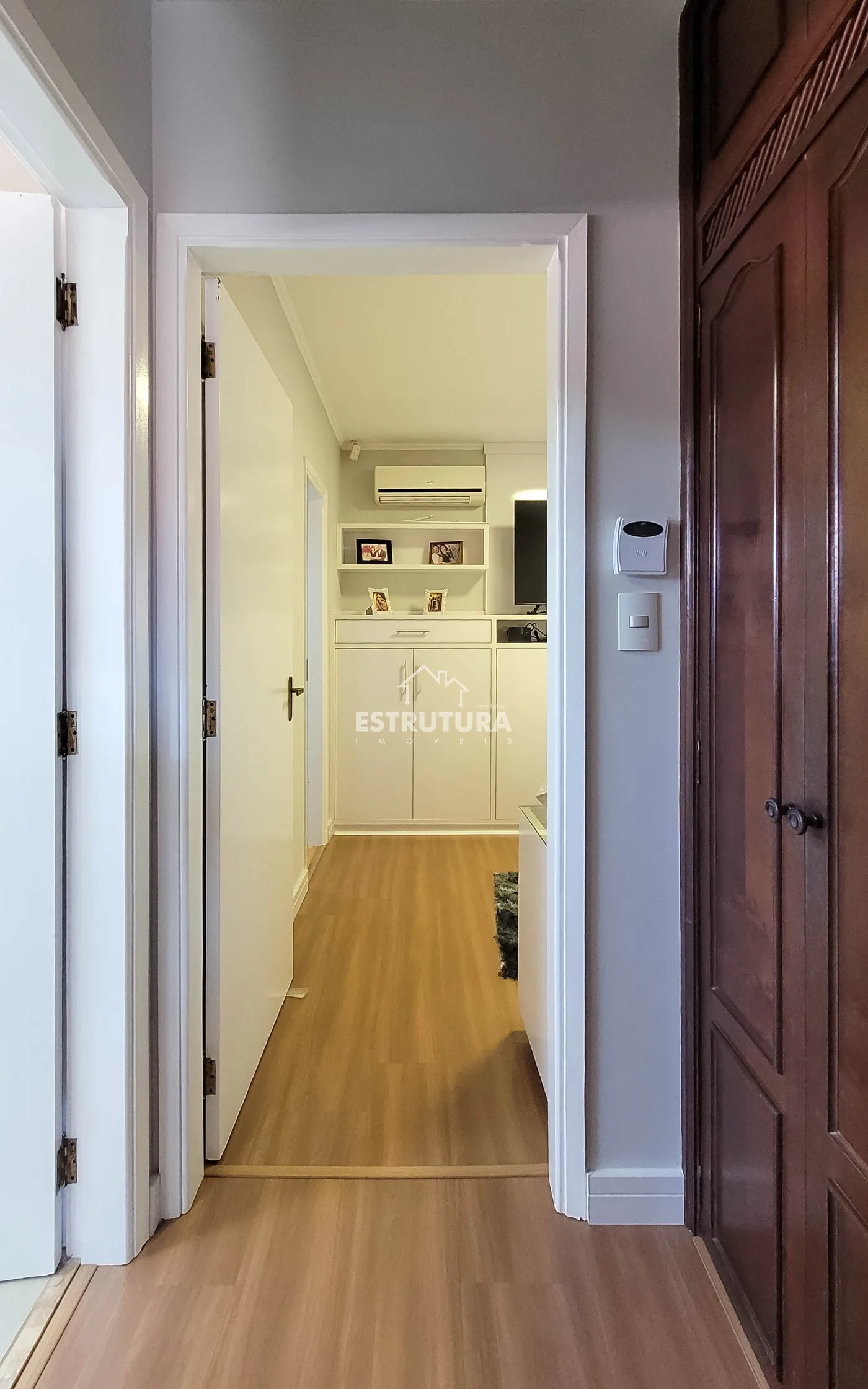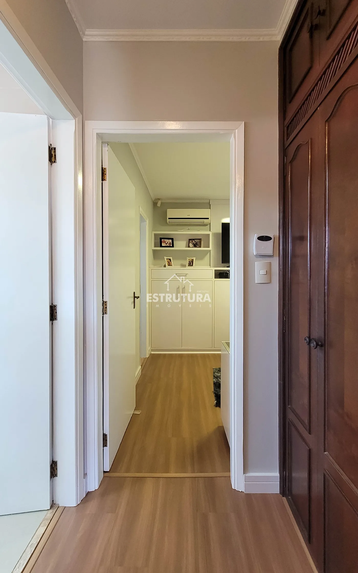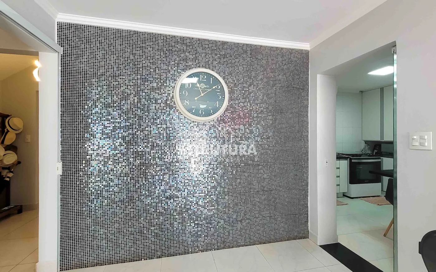 - Hall de entrada/escritório: decorado com papel de parede e lustre de cristal.