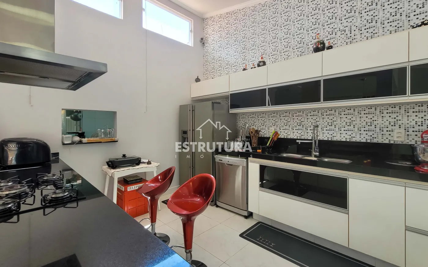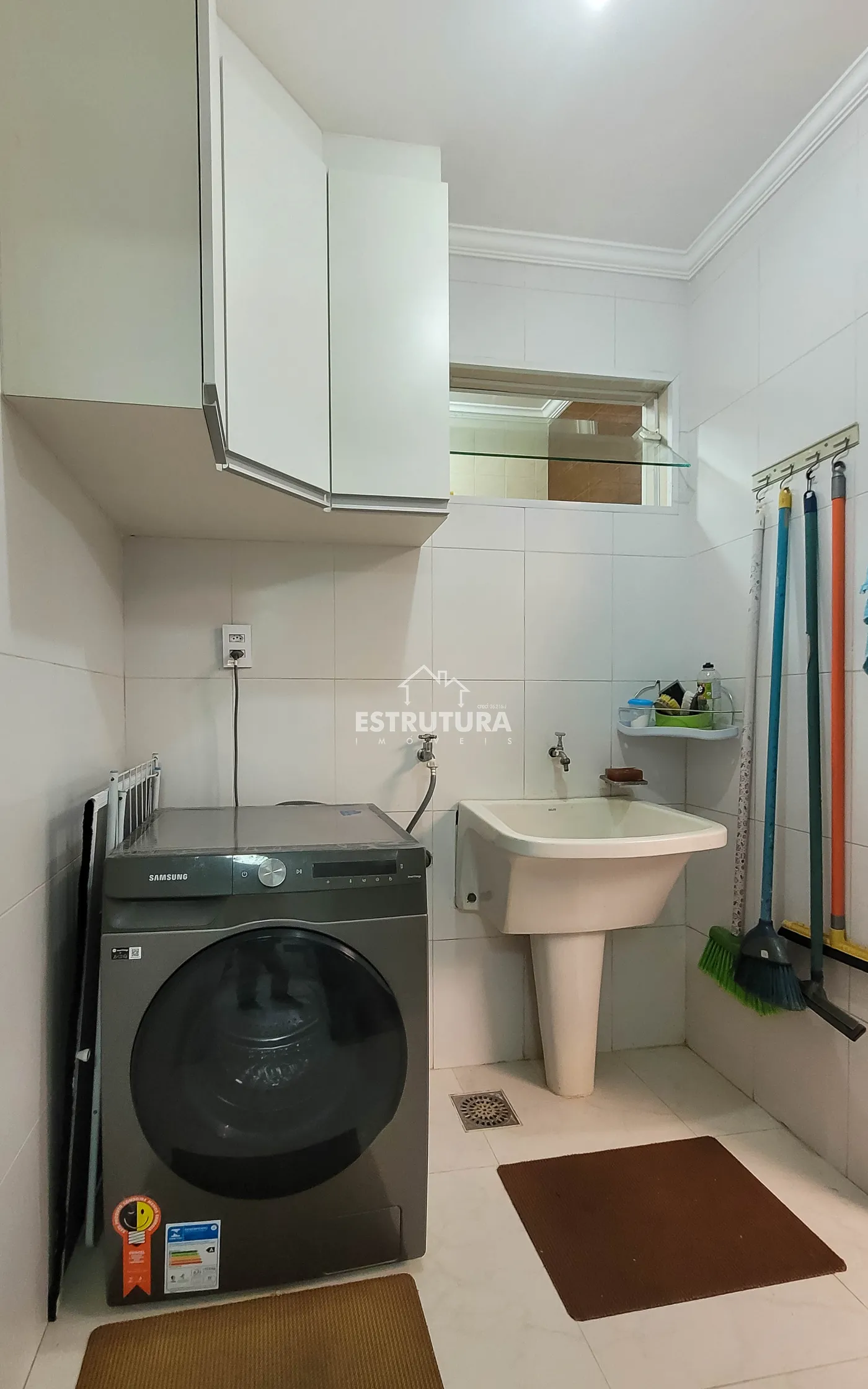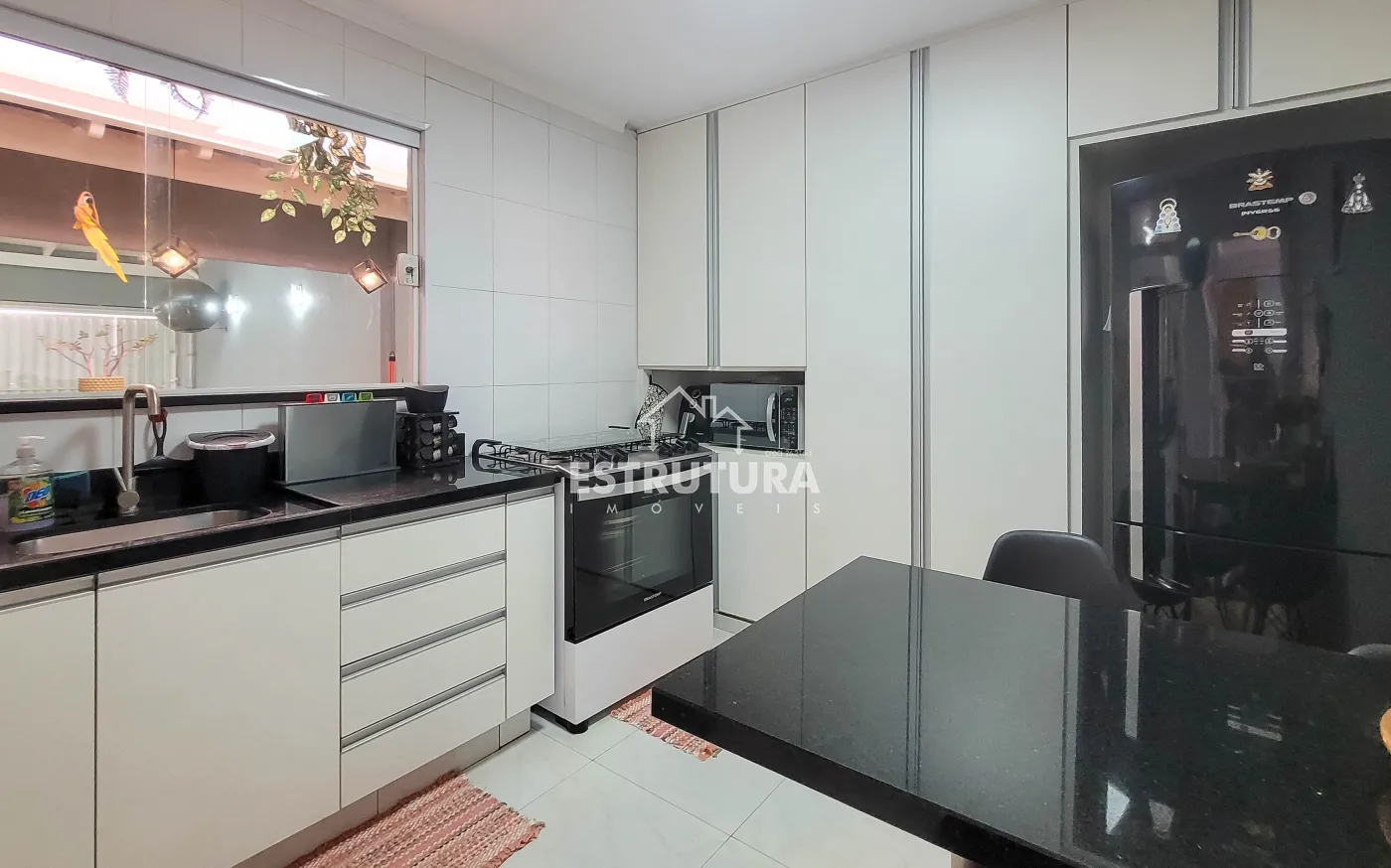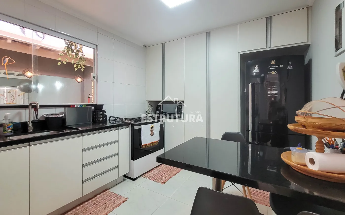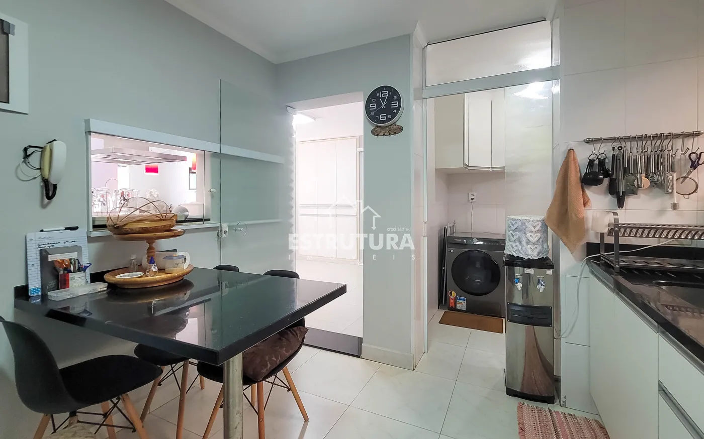 - Cozinha: totalmente revestida em granito, equipada com armários aéreos e gabinetes de aço Itatiaia novos, sugador novo e instalações para lava-louças e bebedouro.