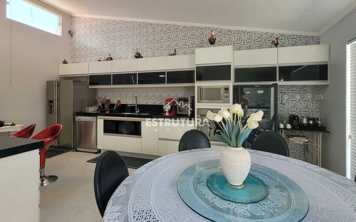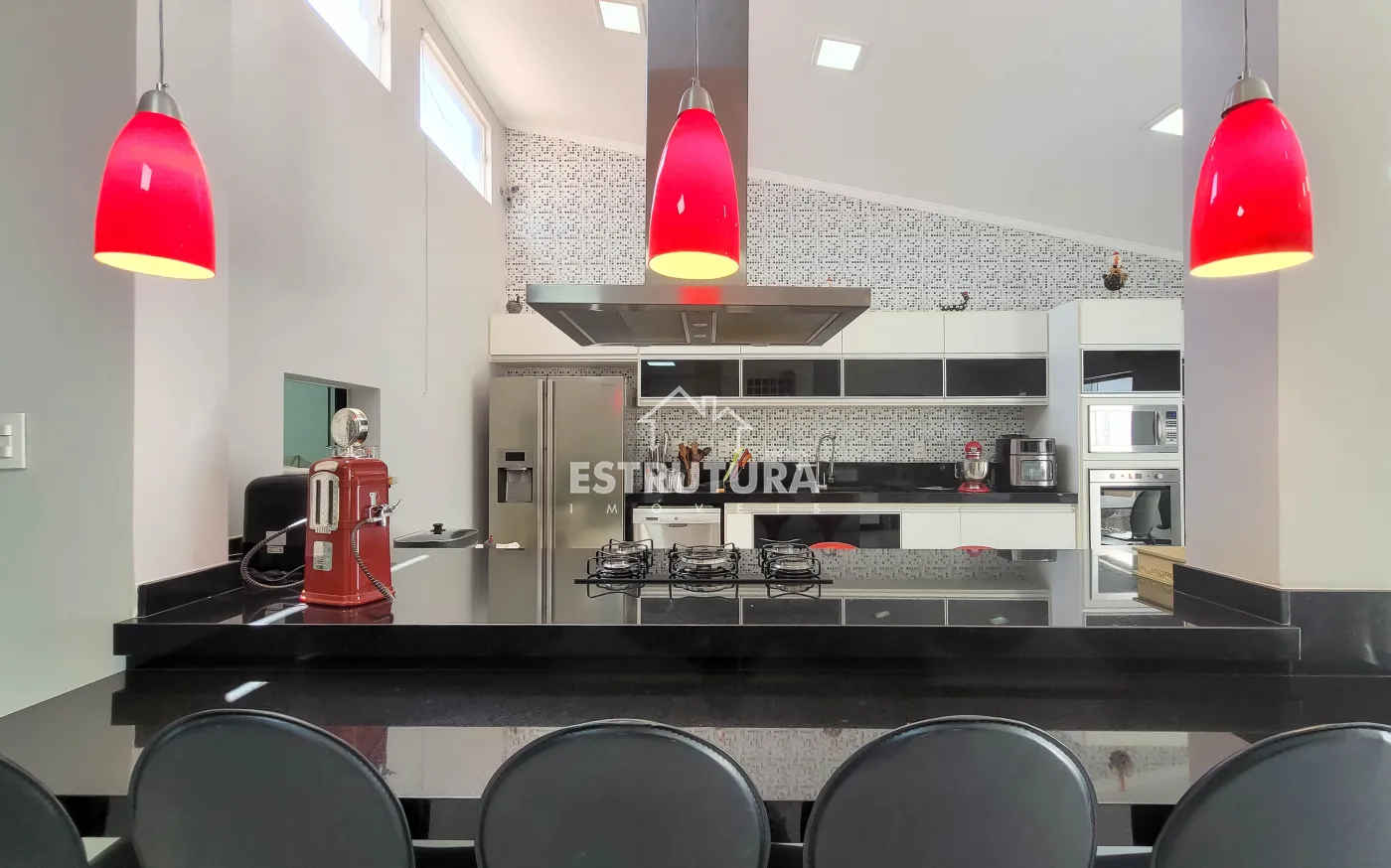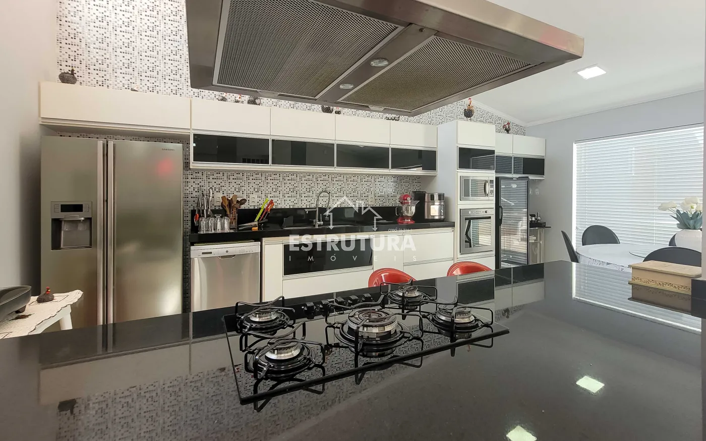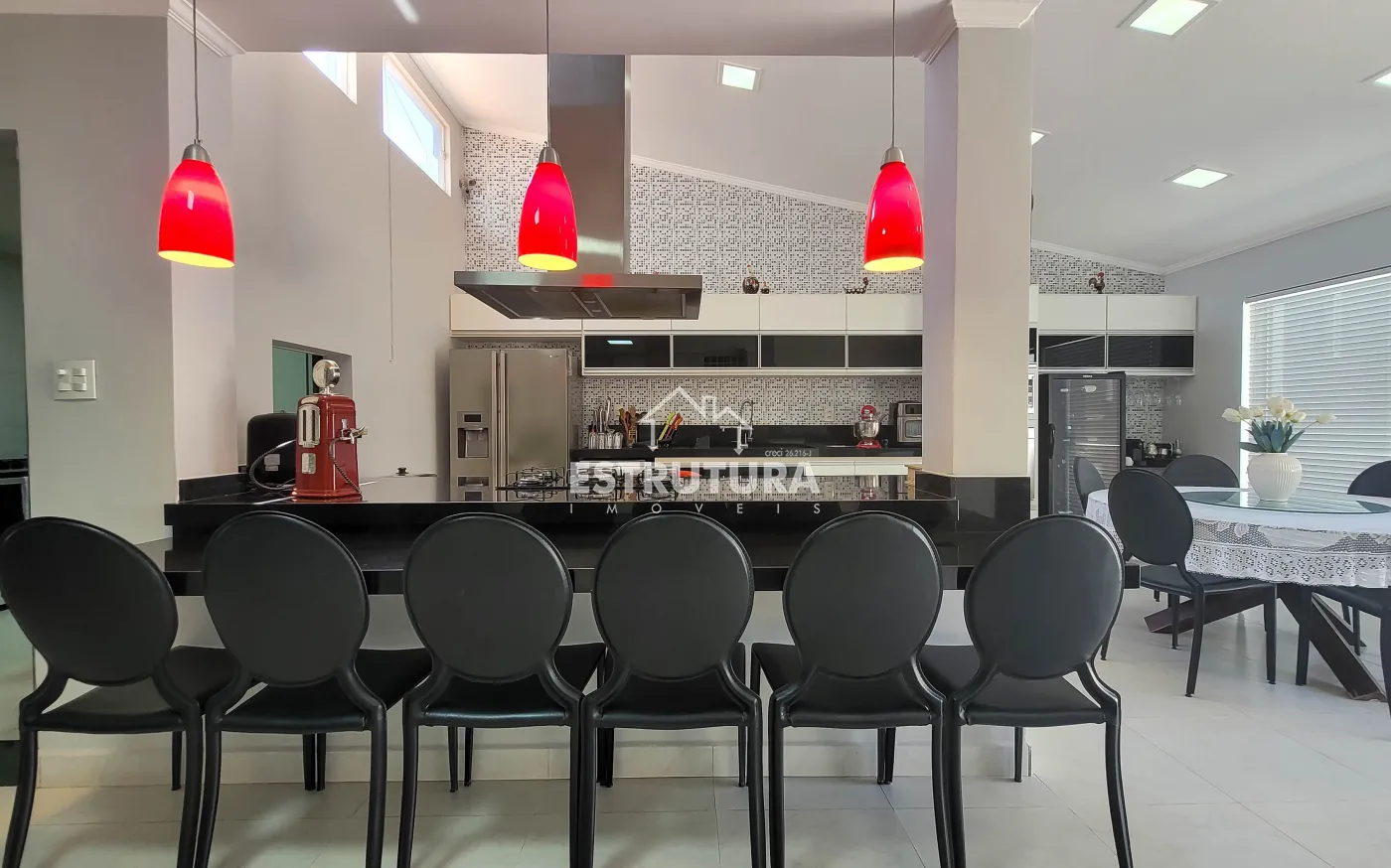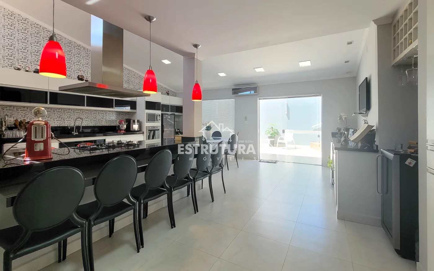 - Cozinha: totalmente revestida em granito, equipada com armários aéreos e gabinetes de aço Itatiaia novos, sugador novo e instalações para lava-louças e bebedouro.