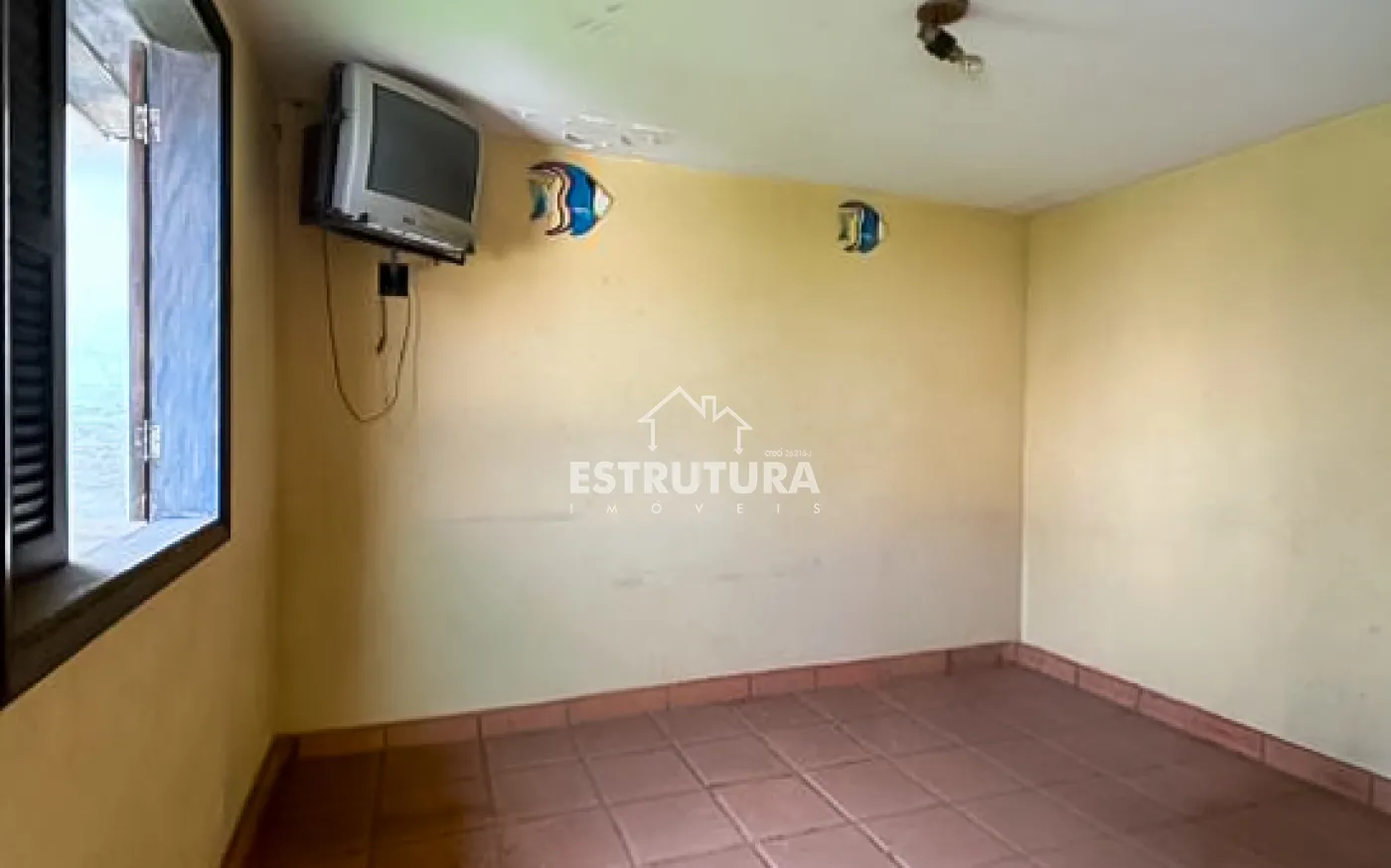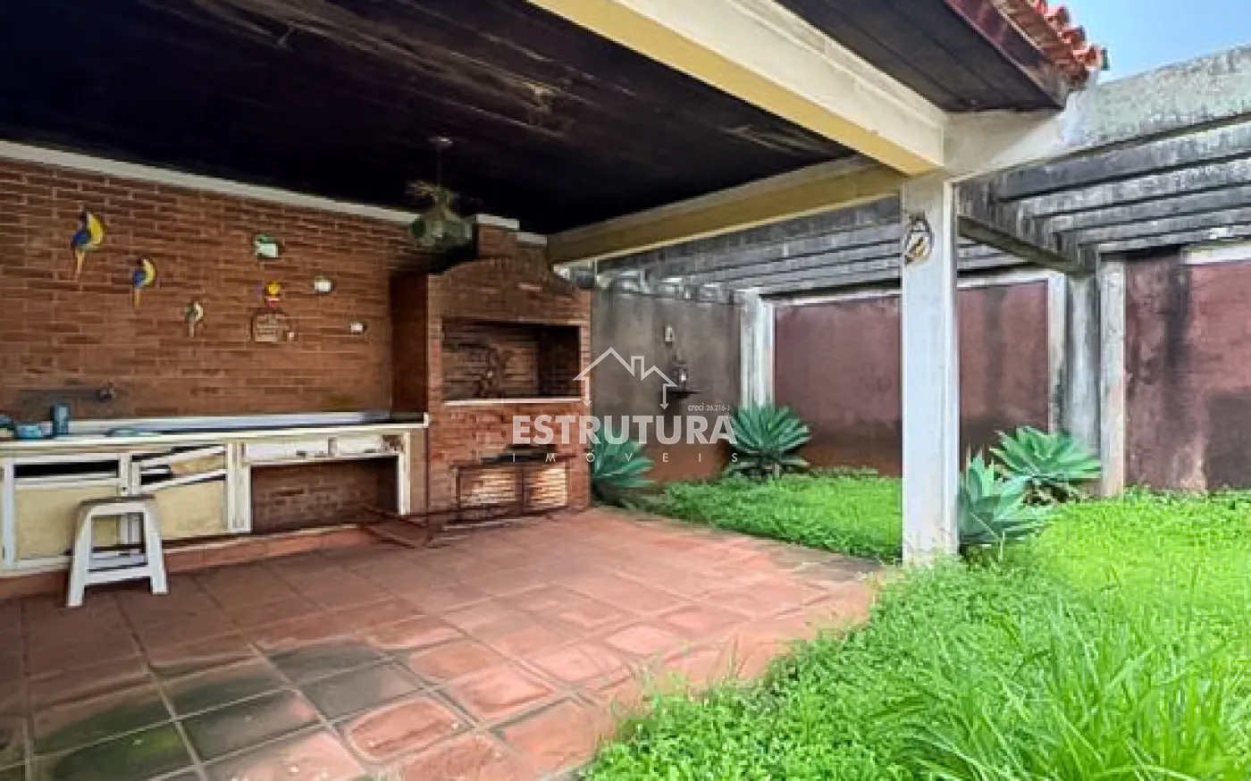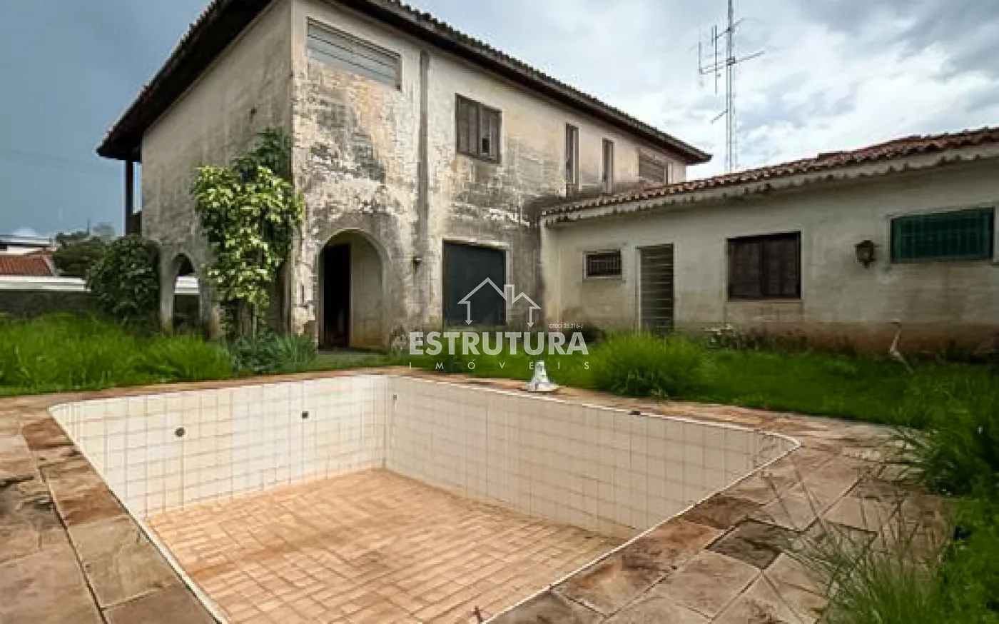 Na área externa, há uma piscina, atualmente fora de uso, necessitando de manutenção.