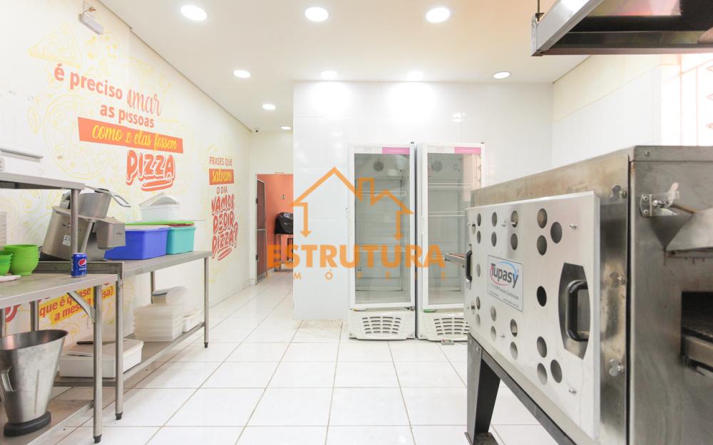 Amplo salão contendo 4 banheiros sociais e, aos fundos, 1 dormitório, sala, cozinha e banheiro social.