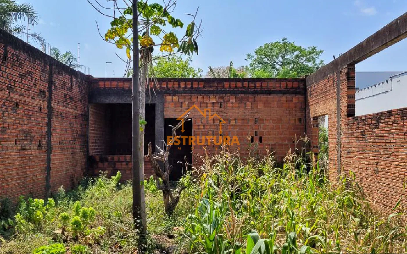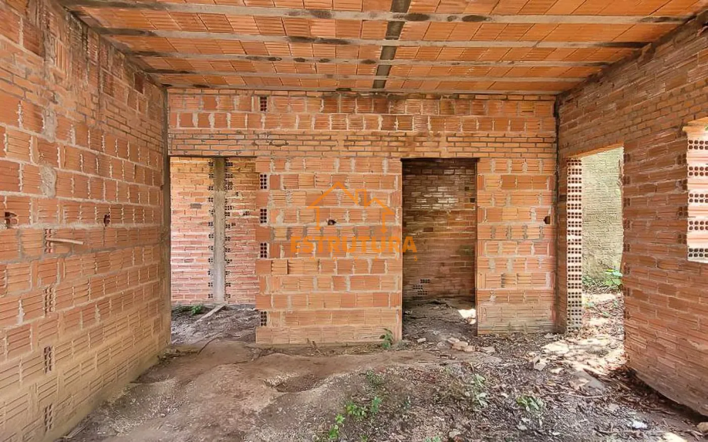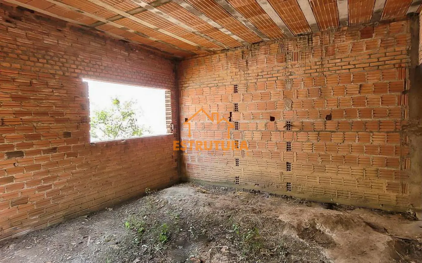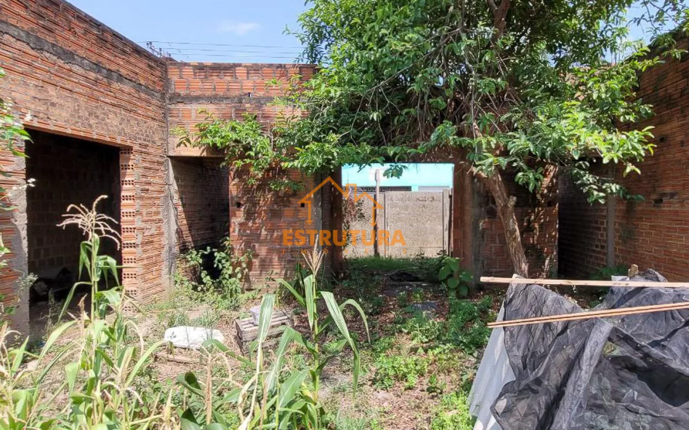 Imóvel à venda com construção parcialmente concluída, incluindo uma espaçosa garagem para vários veículos e um quintal nos fundos. O imóvel possui uma estrutura composta por uma sala, um dormitório, dois banheiros e um rancho.